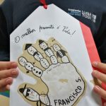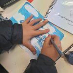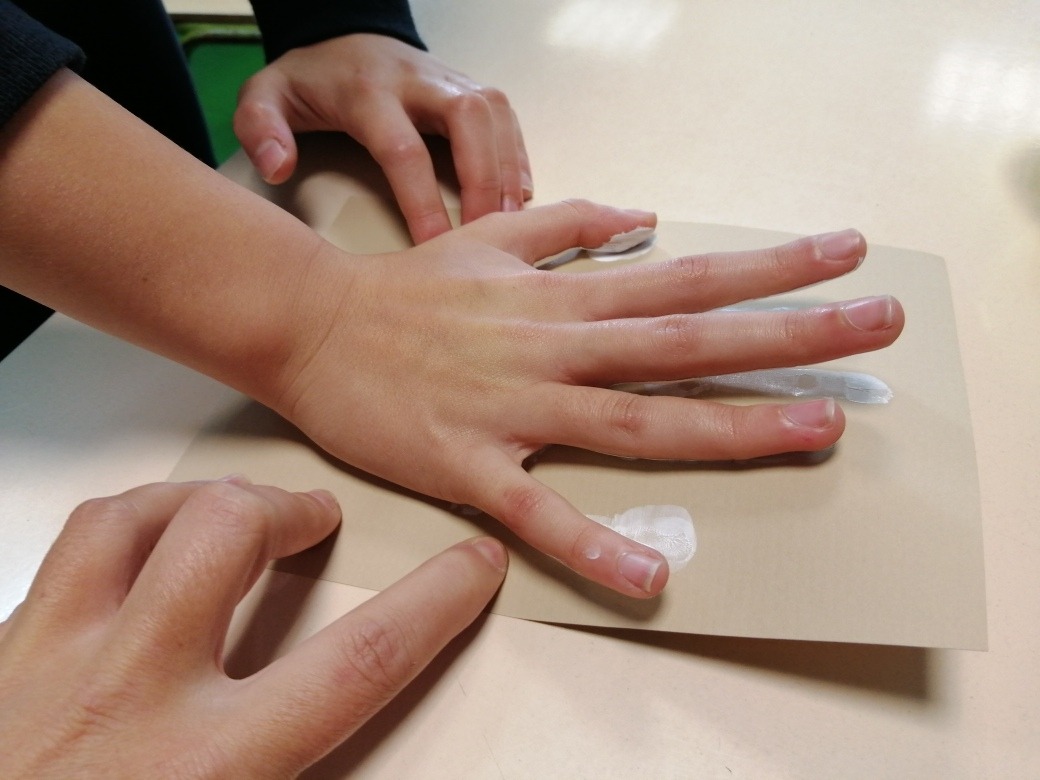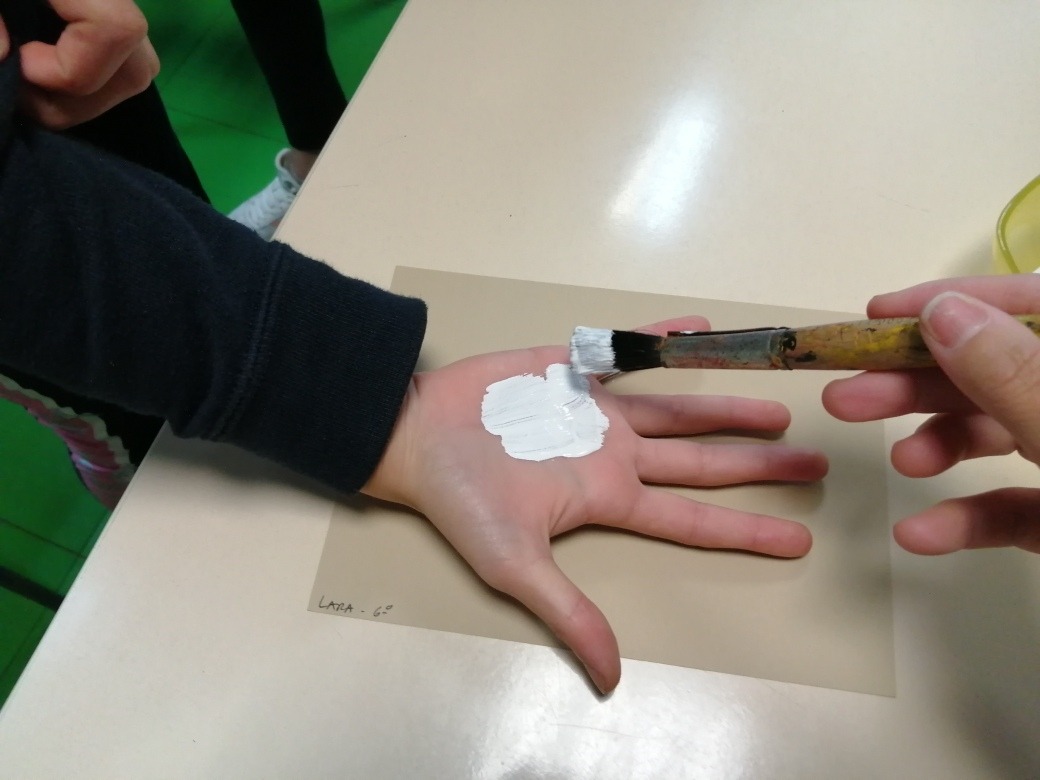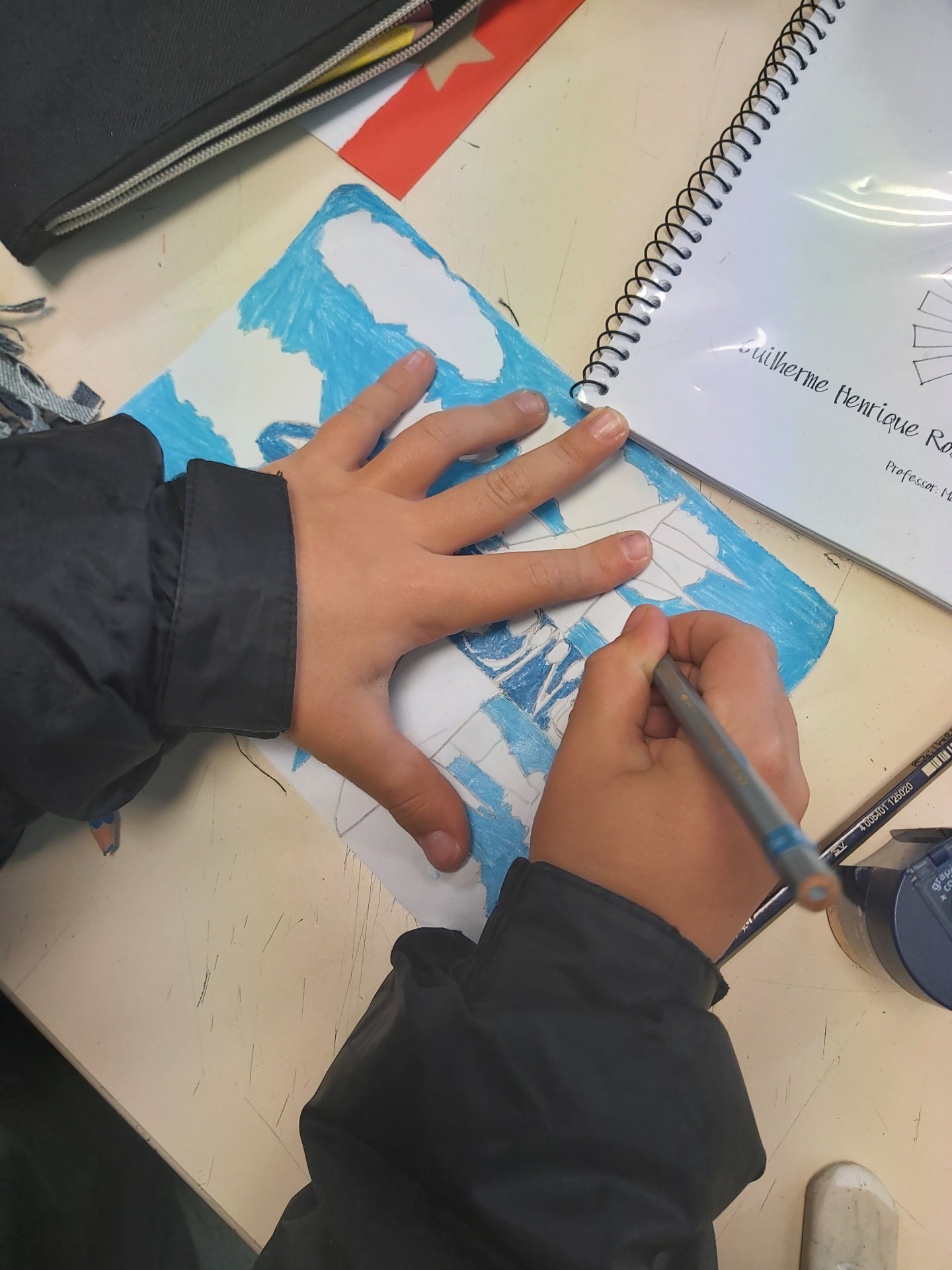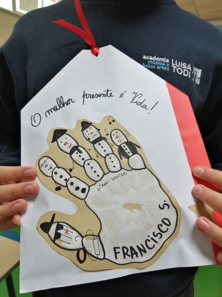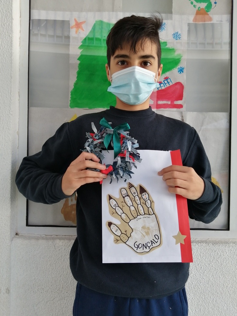 Educação Visual – Realização de pinturas com a boca, os pés e as mãos de forma a representar uma composição natalícia. Elaboração de uma embalagem para a Prenda de Natal, que foi decorada com a técnica de pintura/estampagem/impressão das mãos, juntando uma mensagem alusiva ao tema Paz e Natal.