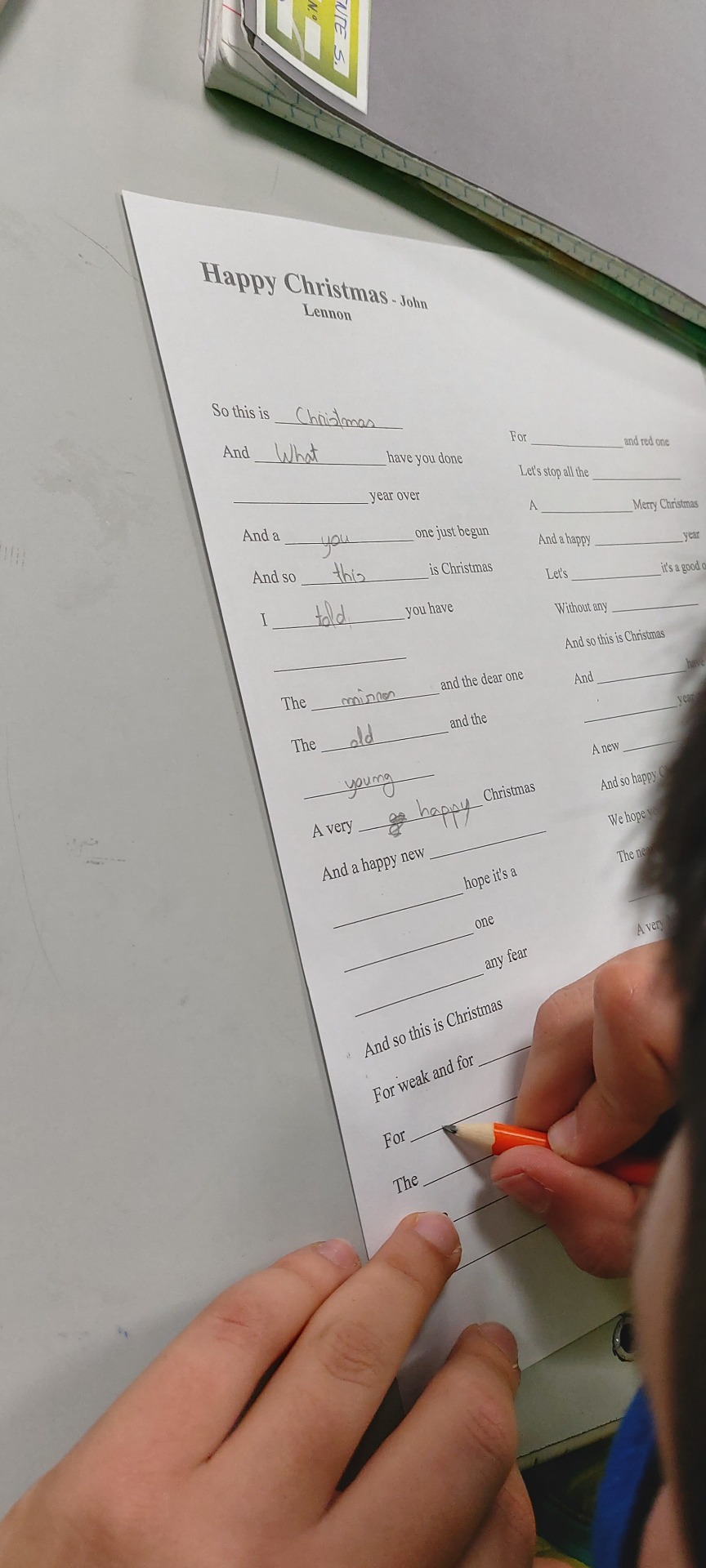 Inglês– Friendship – How can we become friends again? Canções: “Happy Christmas” de John Lennon. Preenchimento de espaços, análise do vocabulário, interpretação da mensagem da música e execução vocal das mesma.