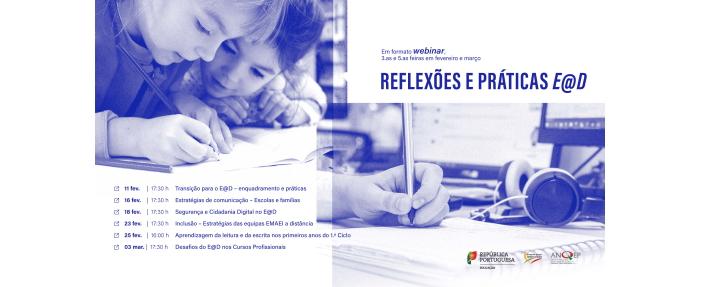 “Com o intuito de apoiar as escolas no desenvolvimento dos seus planos de E@D, clarificar conceitos associados à implementação do ensino a distância, e promover a partilha de práticas de forma a enriquecer e valorizar os processos de ensino, aprendizagem e avaliação nestes tempos de constante desafio, a Direção-Geral da Educação (DGE), em articulação com a Agência Nacional para a Qualificação e o Ensino Profissional, I.P. (ANQEP), irá promover um ciclo de webinars temáticos, que serão divulgados no decurso dos meses de fevereiro e março nos canais da DGE: página da DGE, canal YouTube da DGE, Facebook e Twitter.”