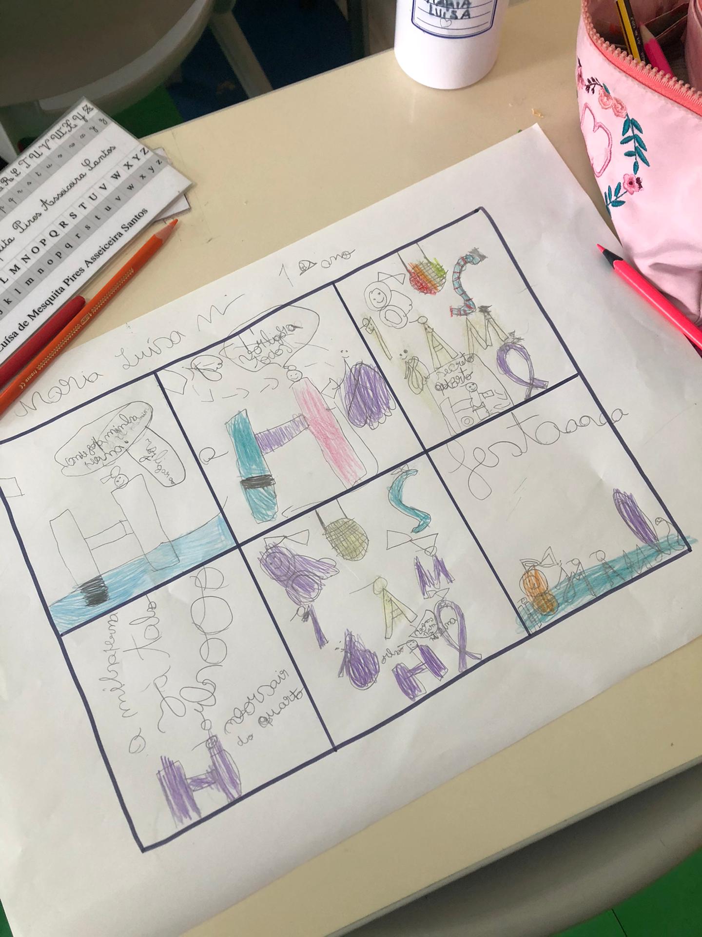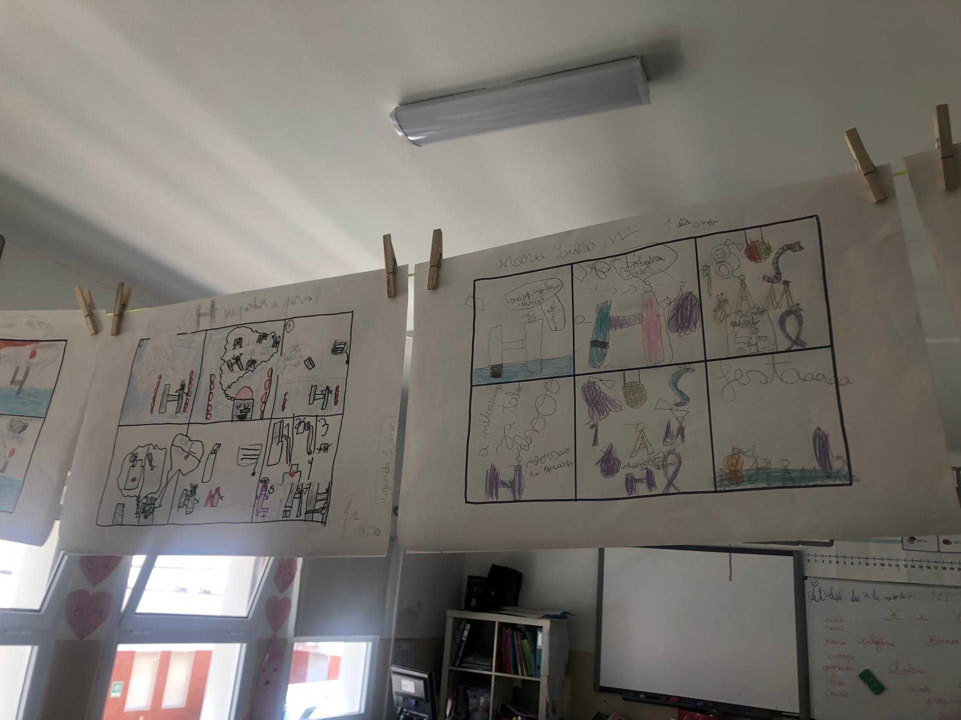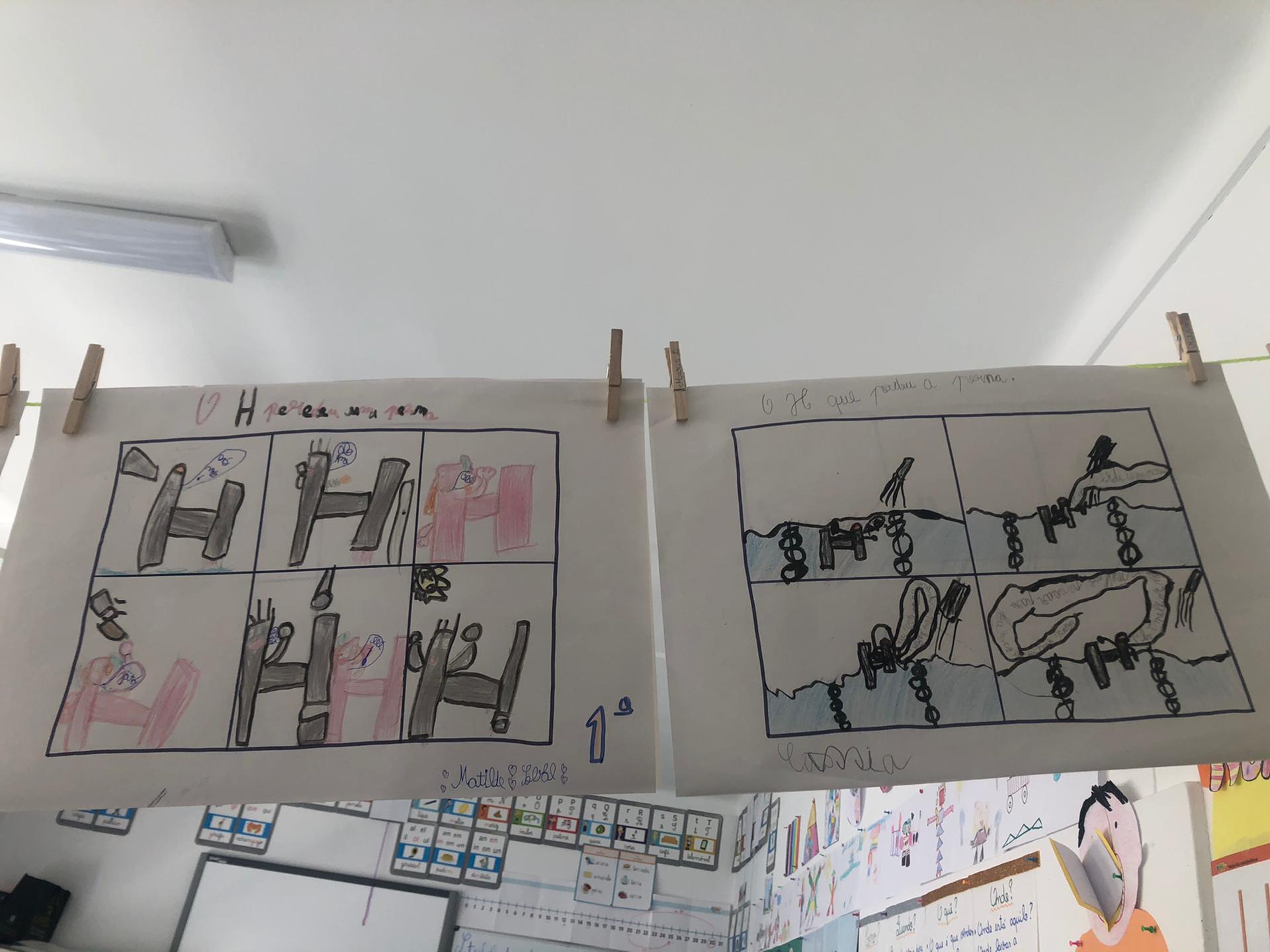 Português Introduzimos a letra “H” com um excerto da história “O H que perdeu uma perna”. Depois de escutarmos a leitura do excerto, tivemos que pedir ajuda à nossa imaginação para solucionar o problema do H. Expusemos a nossa solução, oralmente, à turma. Descobrimos palavras com “h” através de adivinhas! Descobrimos que na língua portuguesa, quando a letra “h” é a primeira letra da palavra, esta letra não tem qualquer som. Contudo, esta letra pode juntar-se às consoantes “c”, “l” e “n” formando três sons diferentes. Reparámos que a inexistência da letra “h” em algumas palavras altera o seu significado. Por fim, analisámos as características de uma Banda Desenhada (BD) e propusemo-nos a construir a nossa própria BD. |