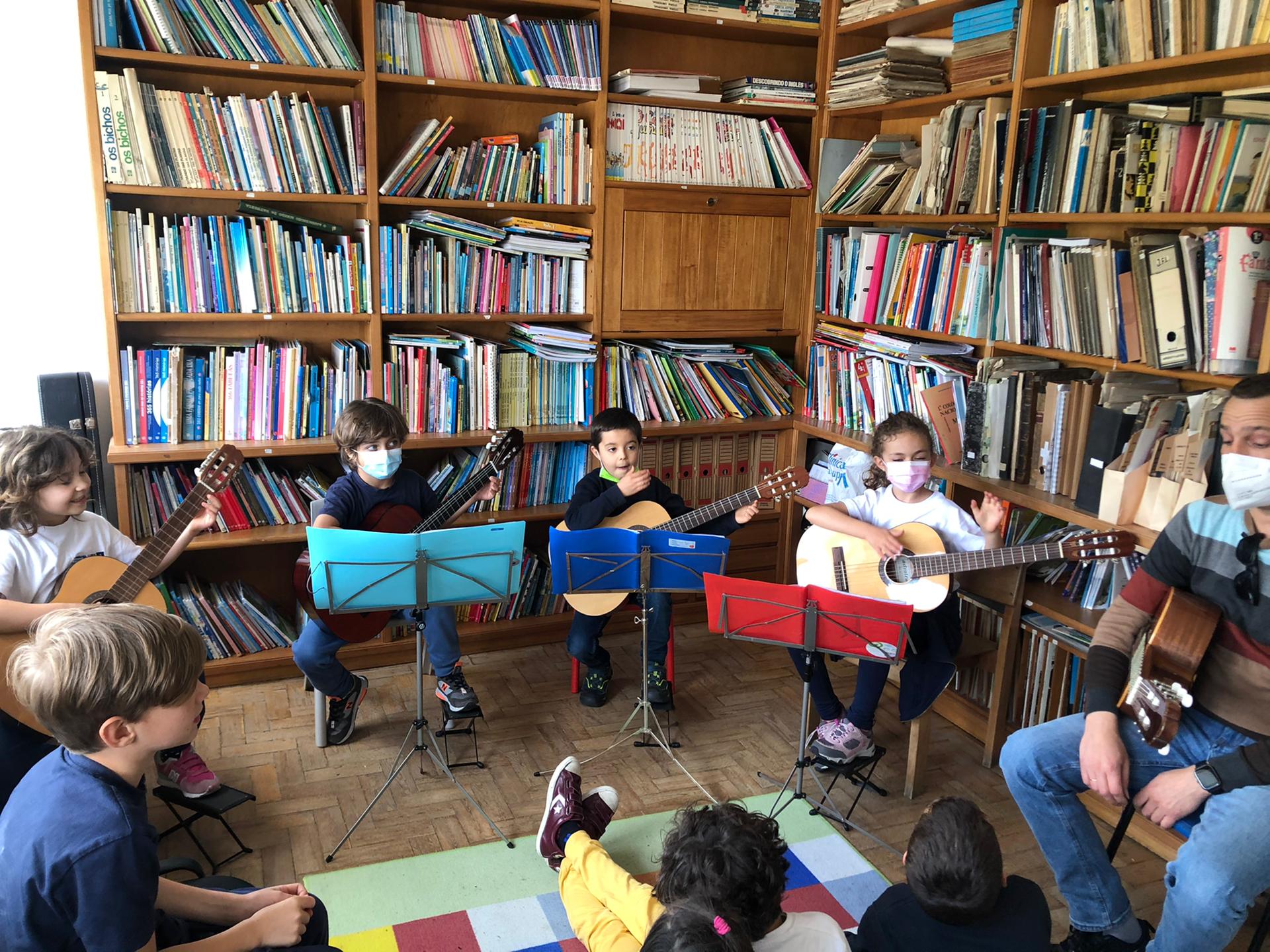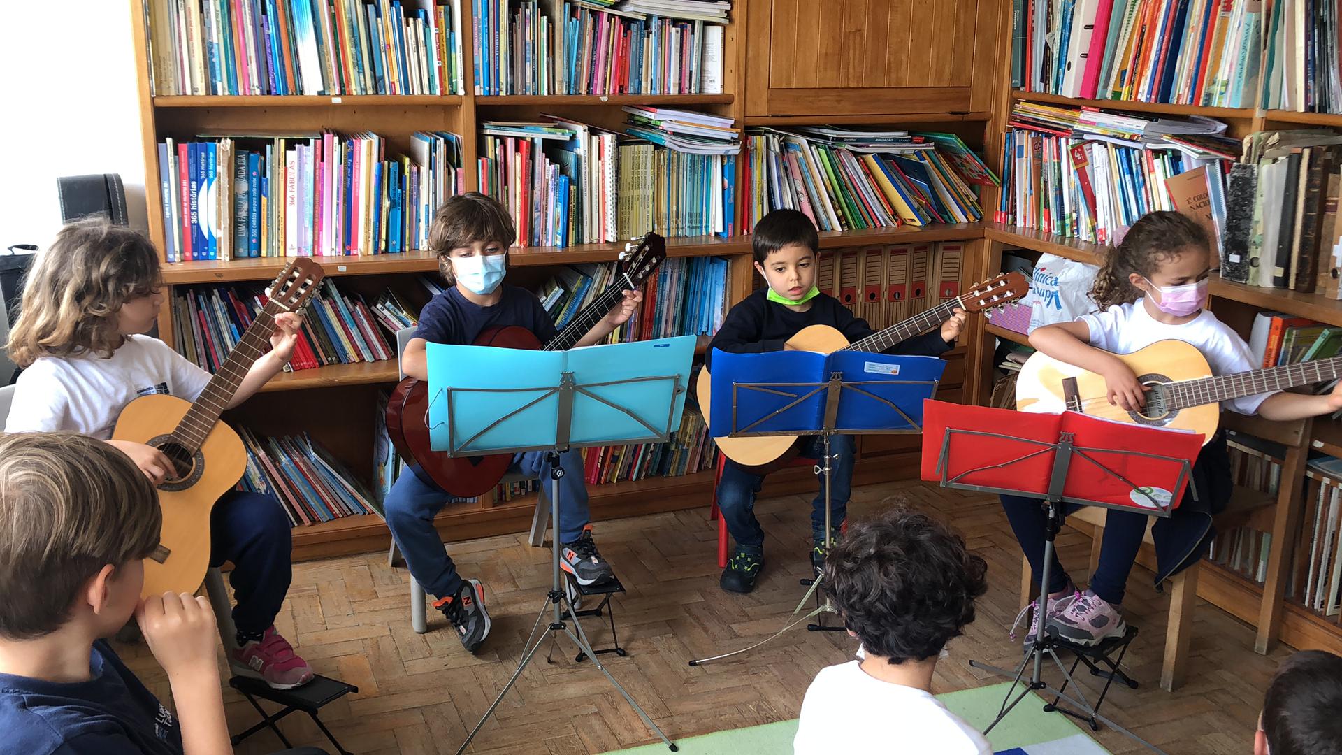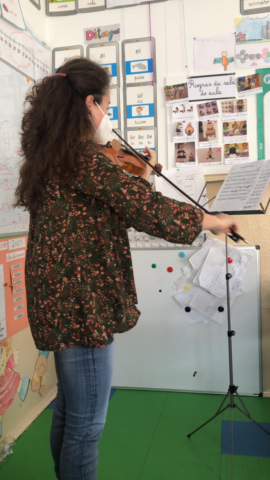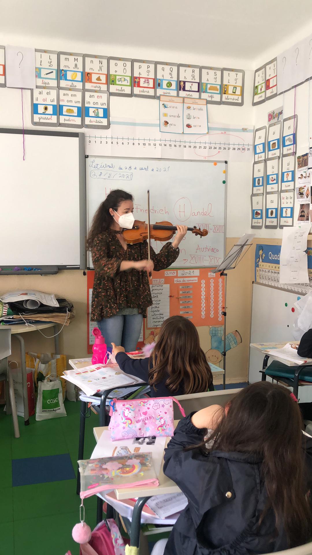 Instrumentos Ao longo destas duas semanas, tivemos duas apresentações! A professora de violino falou-nos de dois compositores, o Händel e o Haydn. Para além disso tocou nós uma peça de cada um dos compositores! Também a Francisca, a Matilde, o José e o Miguel, alunos de guitarra, nos presentearam com uma apresentação conjunta do “Hino da alegria”. |