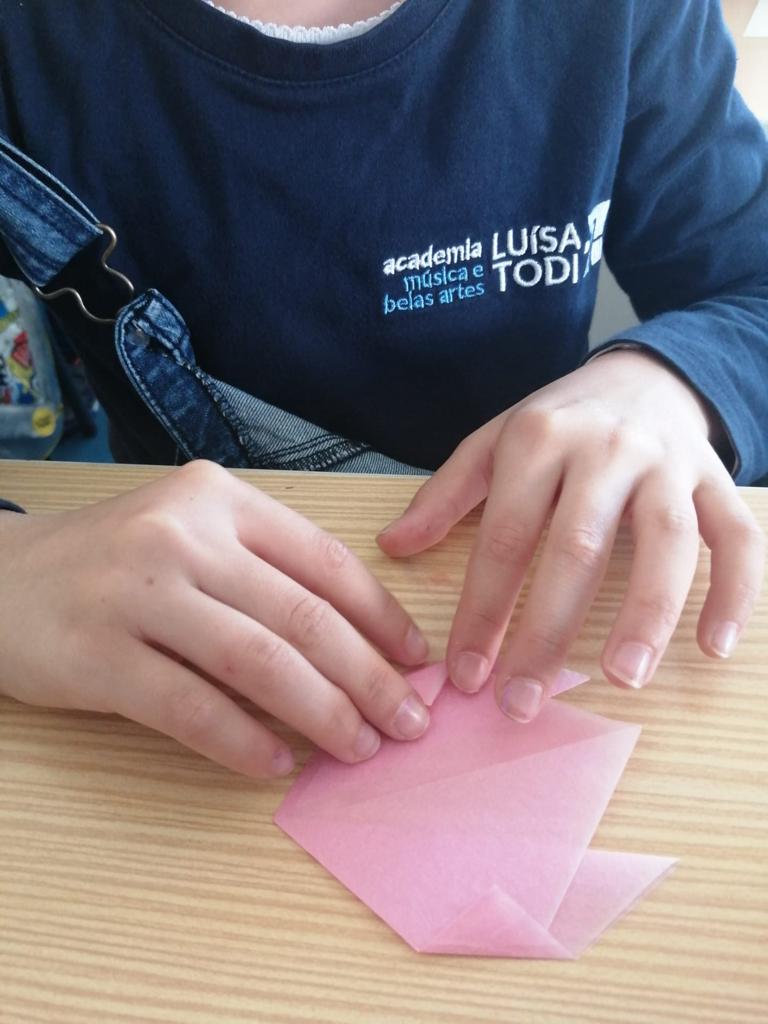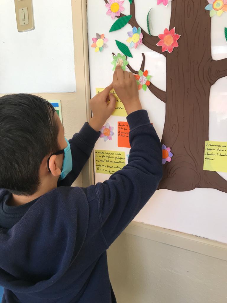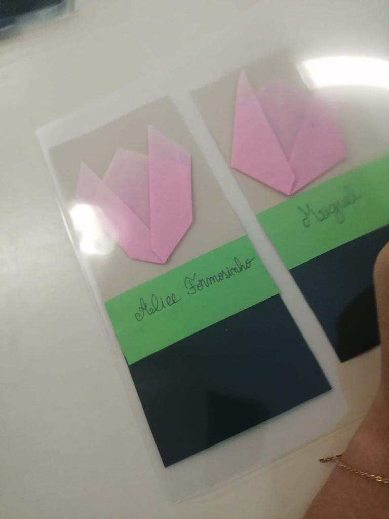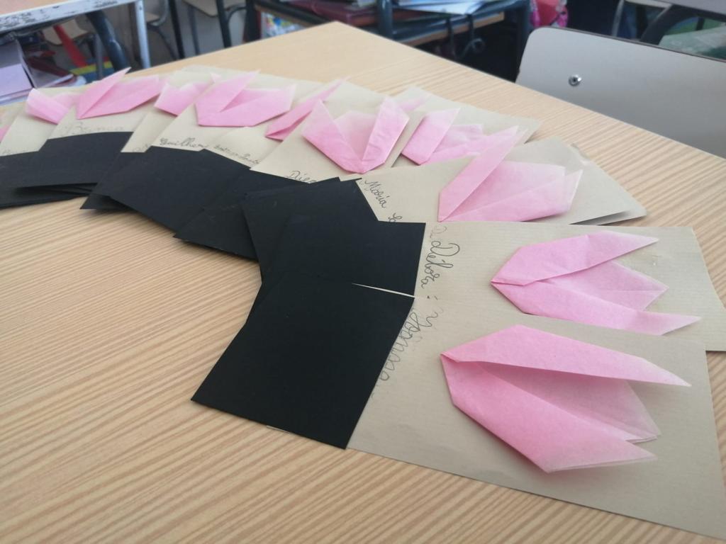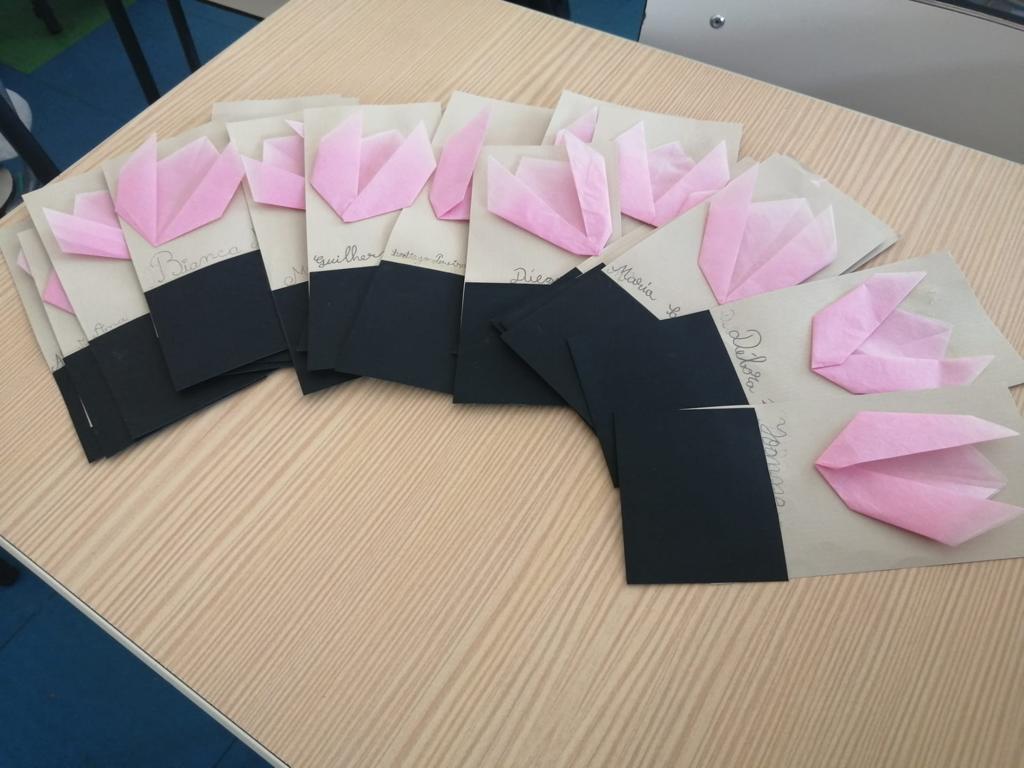 Na aula de Educação Musical, os alunos aprenderam a canção “O Girassol” e, em Artes Visuais, elaboraram marcadores de livros a partir de tulipas em origami.