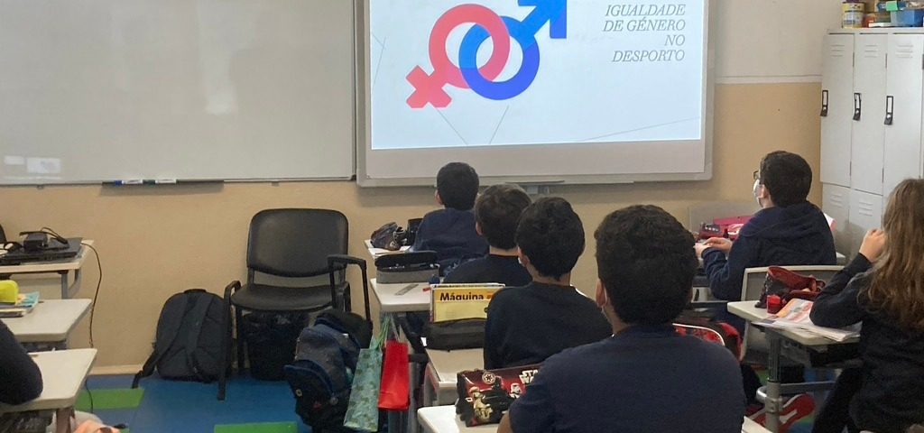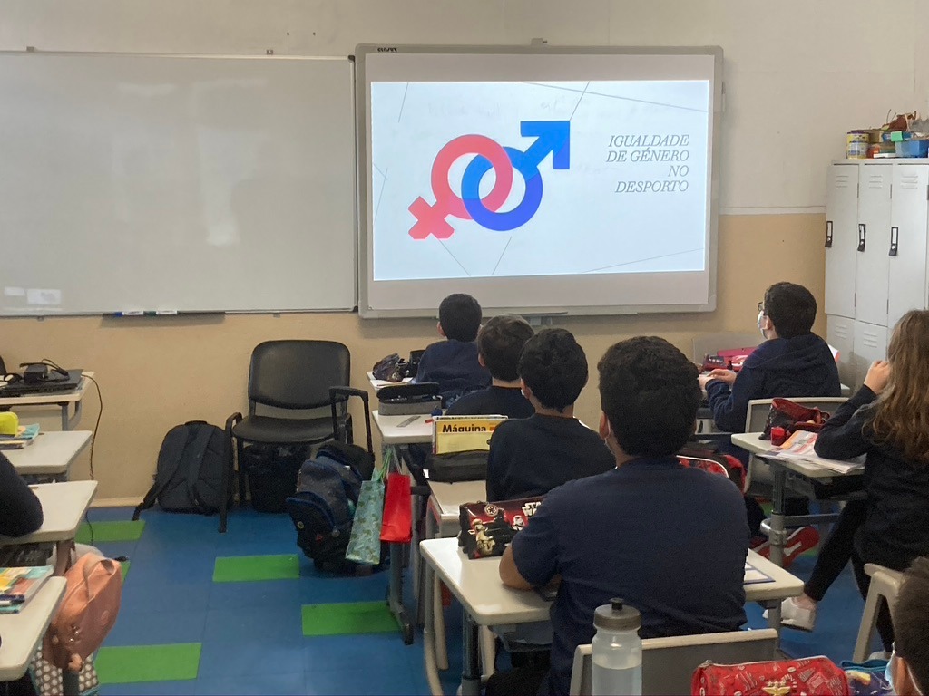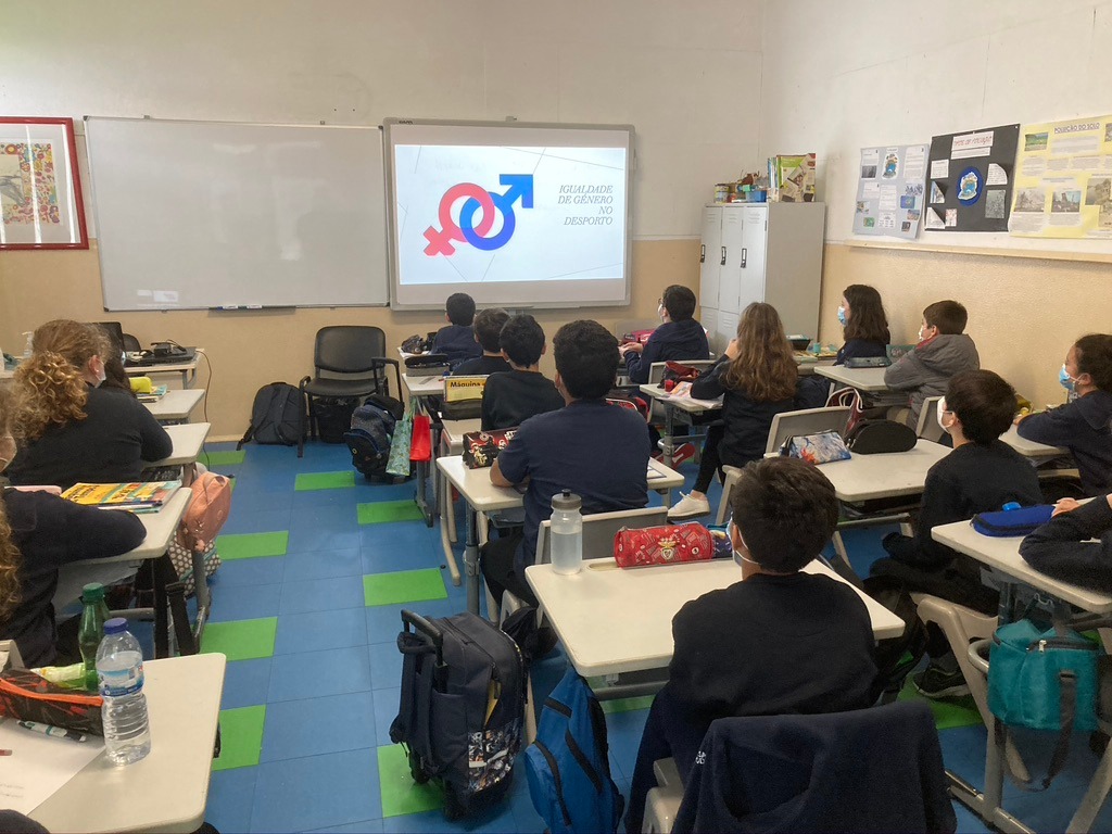Educação Física – Apresentação do tema Igualdade de Género no Desporto. Exploração do panorama do Desporto Português no que diz respeito à distribuição de géneros nas diferentes modalidades desportivas. Visionamento de um Vídeo com a apresentação do Corfebol, modalidade desportiva coletiva que promove de forma regulamentar a igualdade de géneros.