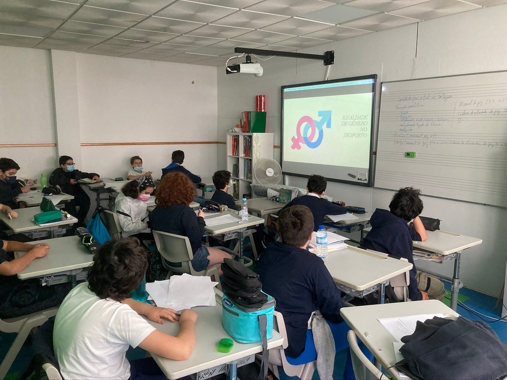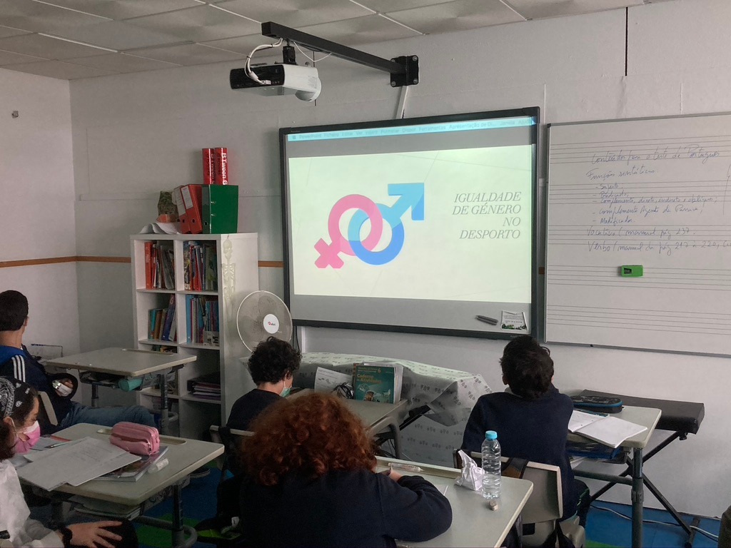 Educação Física – Apresentação do tema Igualdade de Género no Desporto. Exploração do panorama do Desporto Português no que diz respeito à distribuição de géneros nas diferentes modalidades desportivas. Visionamento de um Vídeo com a apresentação do Corfebol, modalidade desportiva coletiva que promove de forma regulamentar a igualdade de géneros.