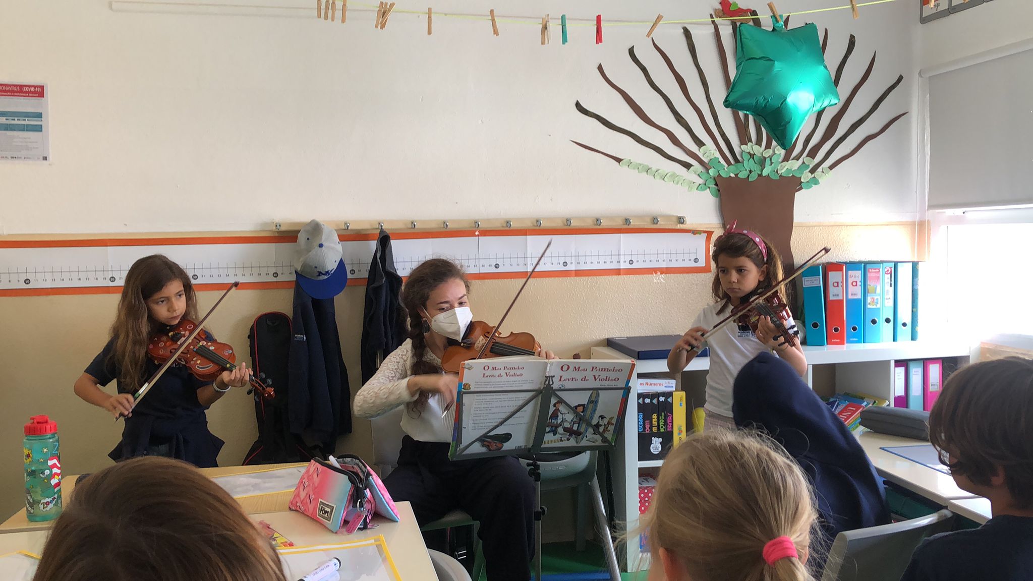 Vimos e escutámos a “Orquestra feminina do Afeganistão”. A partir do DAC com a obra “O menino que colecionava palavras”, o professor Nuno trabalhou com a turma as figuras rítmicas da música (semínimas, colcheias, tercinas e semicolcheias) através da divisão silábica das palavras. Foi pedido aos alunos que marcassem uma pulsação e executassem os vários exercícios compostos para o momento. A professora Joana trouxe a música tradicional portuguesa para o interior da nossa sala. Além disso, contou com a participação das alunas Matilde Xavier e Maria Luísa Santos.