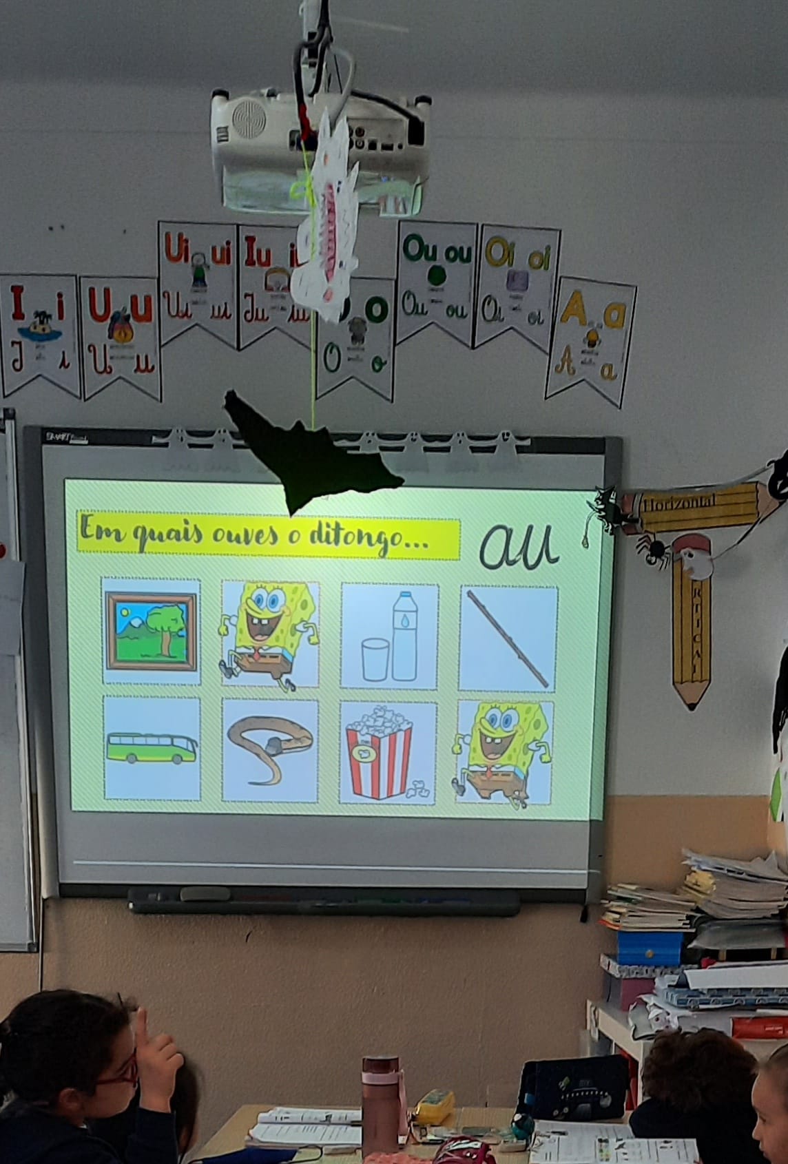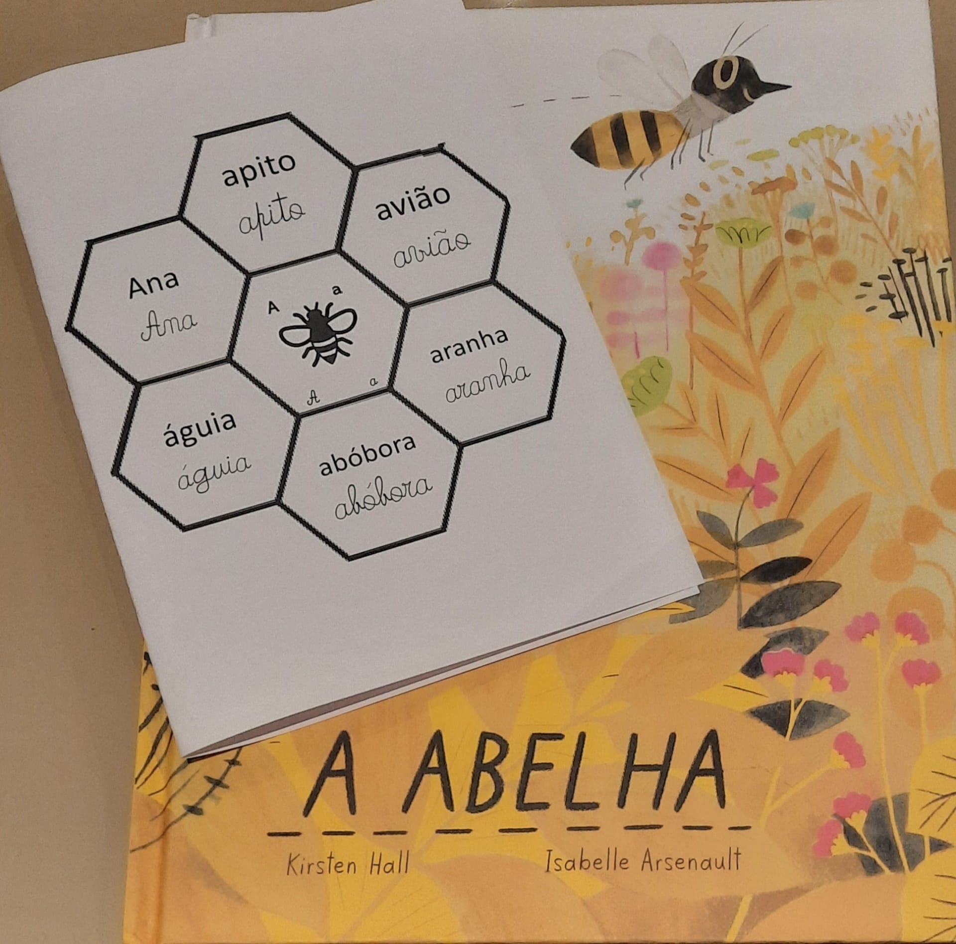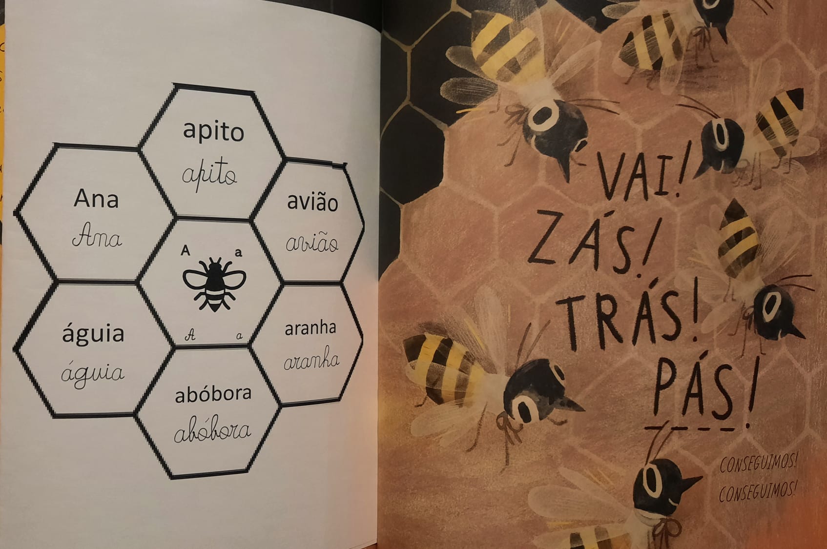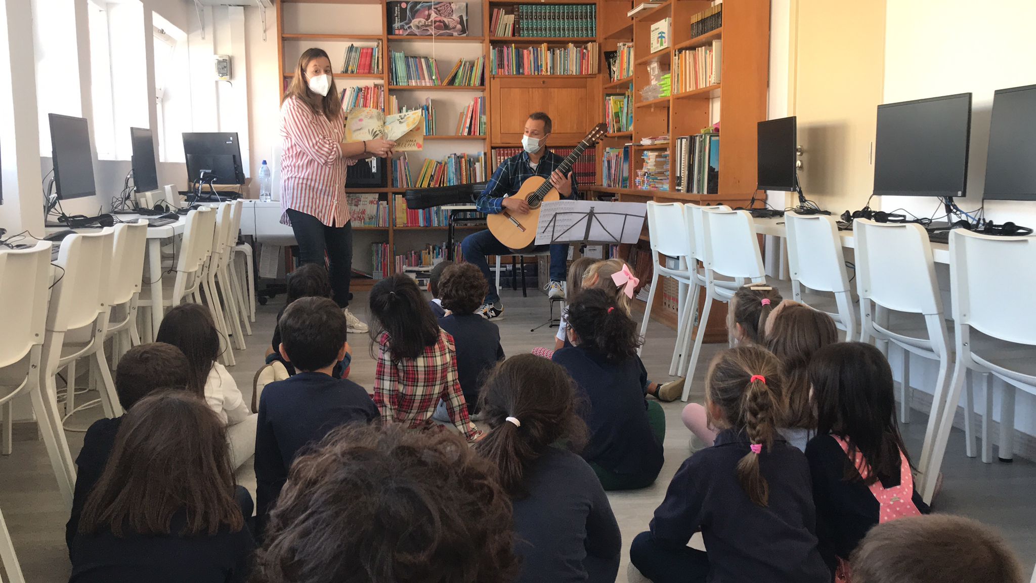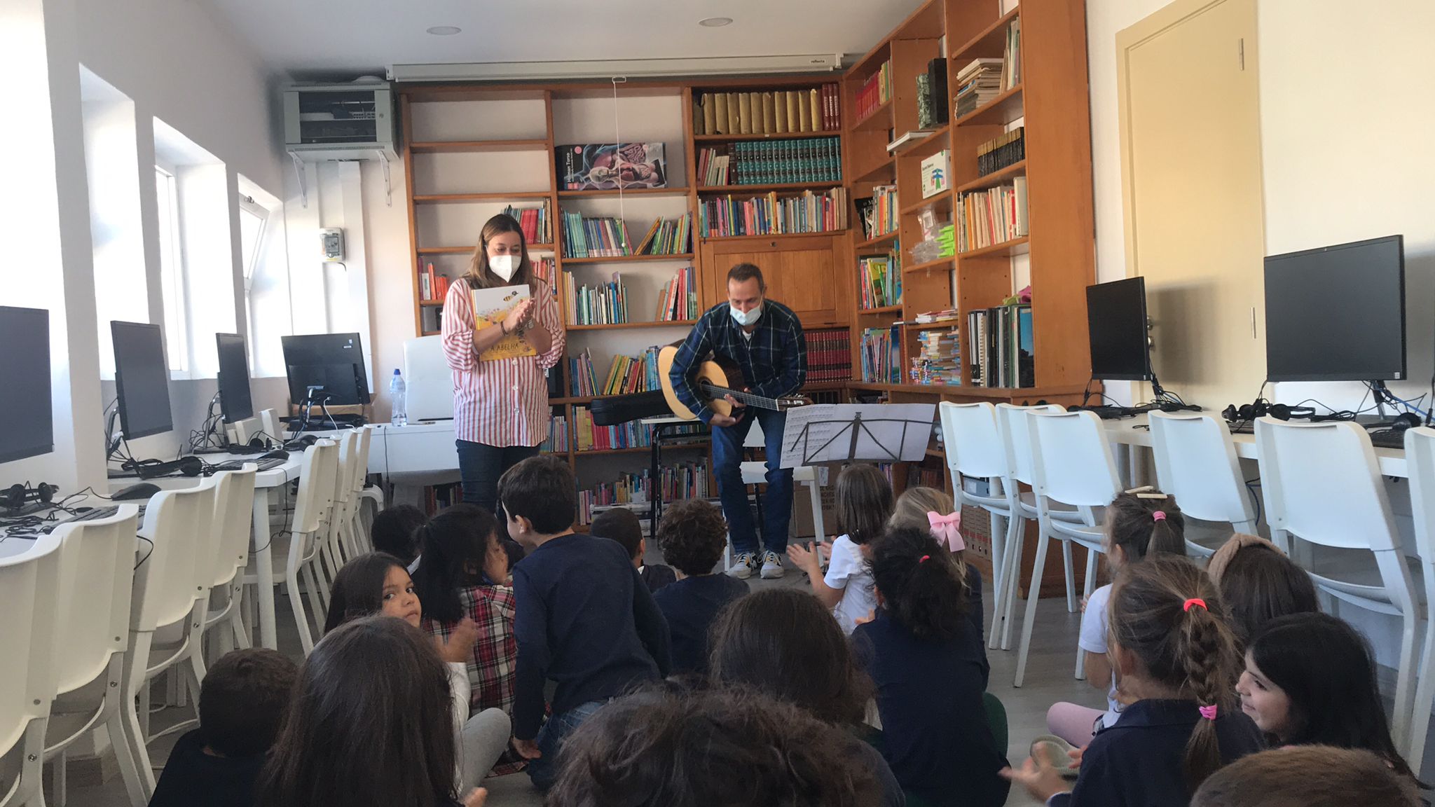 No Português foi apresentado um poema do livro ABC dos animais, de Rosa Lobato Faria. de onde surgiram várias palavras começadas com a letra a; ou que a continham. Identificaram palavras em frases, dividiram palavras em sílabas e daqui chegaram à letra. Exploraram a história e descobriram o grafema a, utilizando vários recursos. Para descobrirmos os ditongos foi apresentada a história “A abelha”, de Kristen Hall , acompanhada pelo professor de guitarra, Nuno Santos, que tocou a música El abejorro, de E. Pujol.