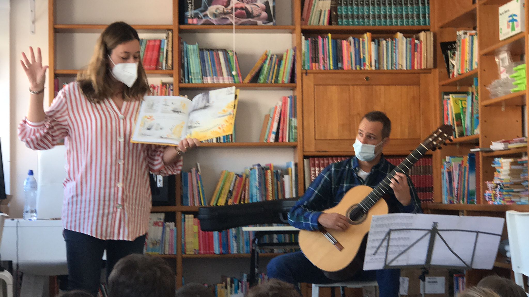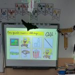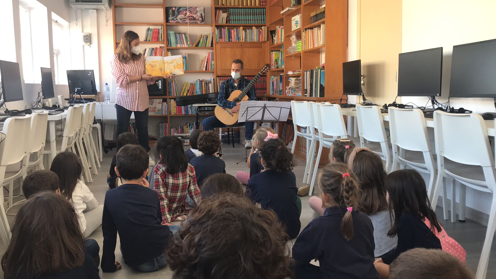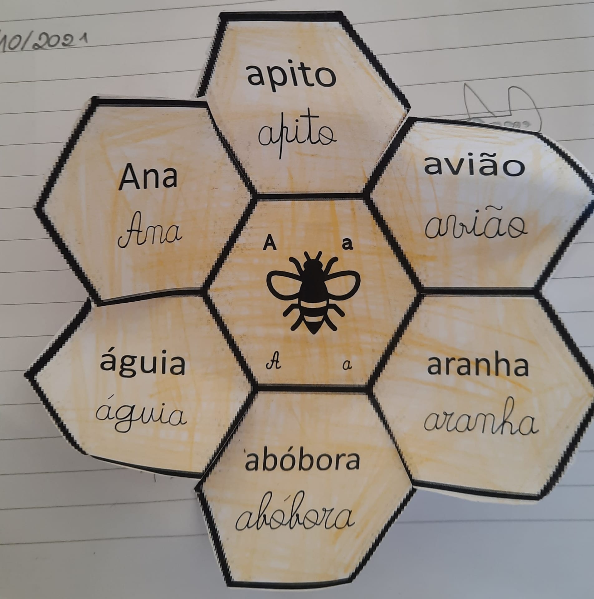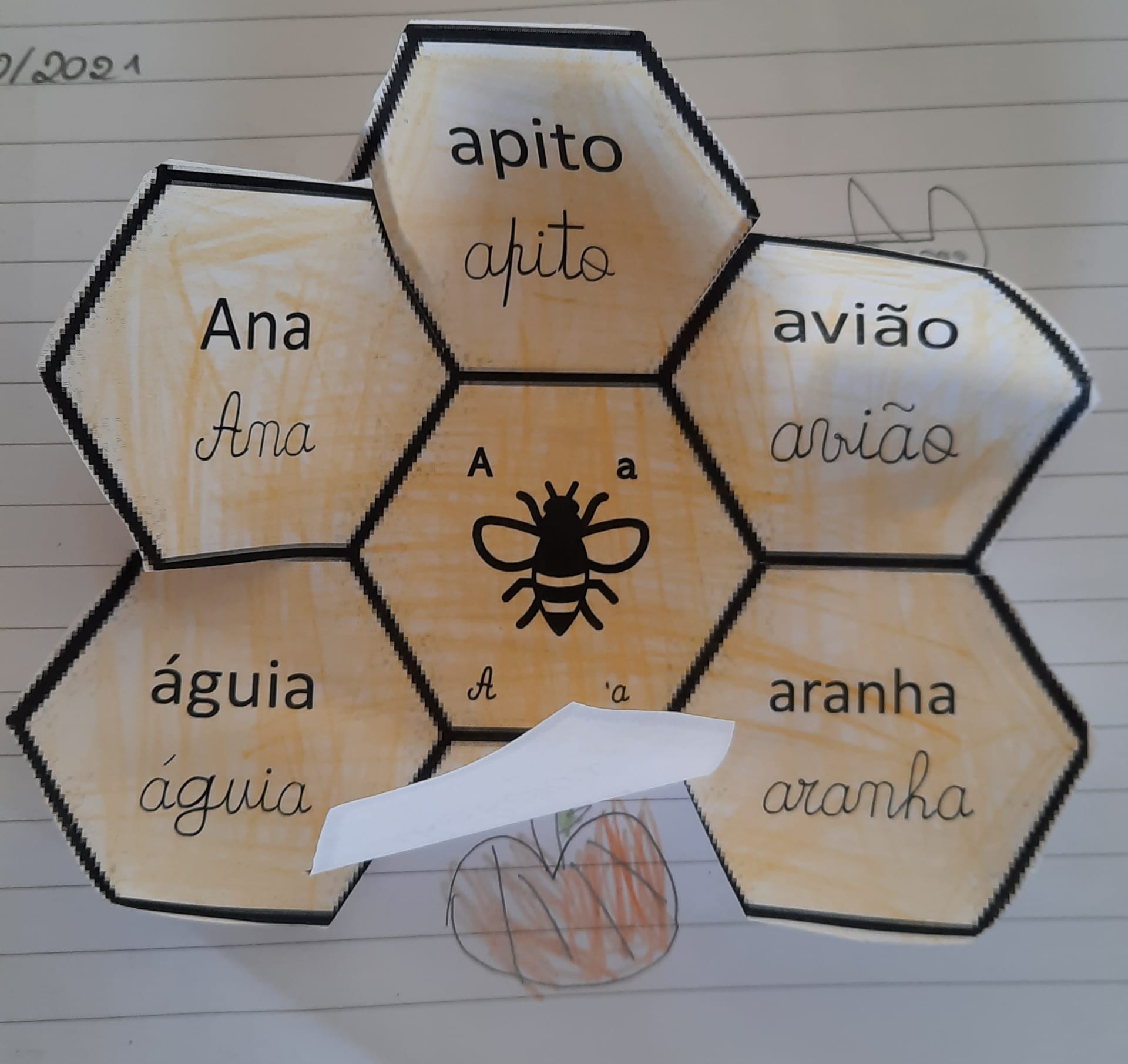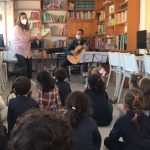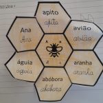 No Português foi apresentado um poema do livro ABC dos animais, de Rosa Lobato Faria. de onde surgiram várias palavras começadas com a letra a; ou que a continham. Identificaram palavras em frases, dividiram palavras em sílabas e daqui chegaram à letra. Exploraram a história e descobriram o grafema a, utilizando vários recursos. Para descobrirmos os ditongos foi apresentada a história “A abelha”, de Kristen Hall , acompanhada pelo professor de guitarra, Nuno Santos, que tocou a música El abejorro, de E. Pujol.