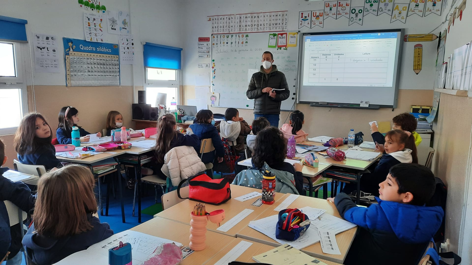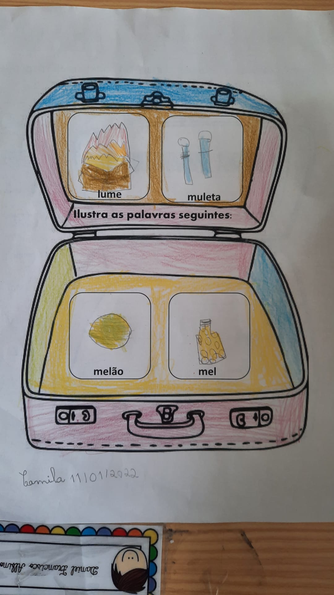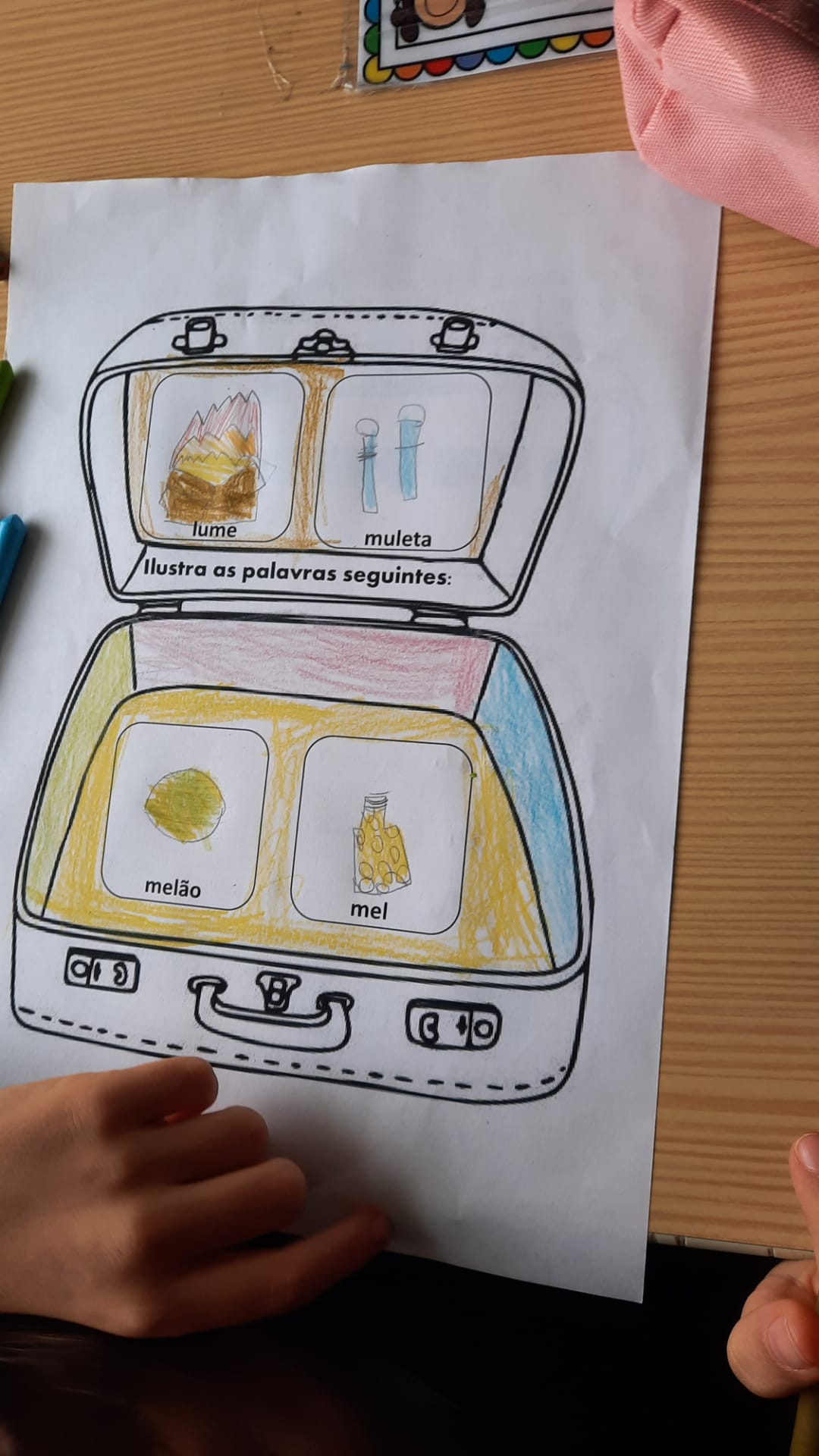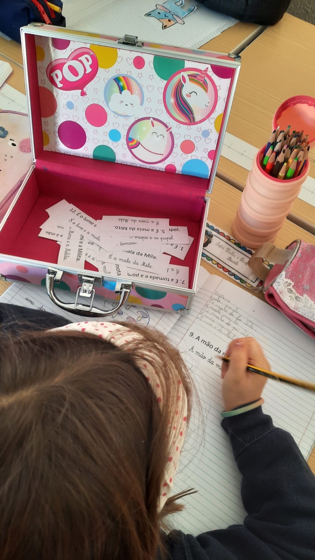 Em português foi apresentado o livro Mia e a montanha,  de onde surgiram várias palavras começadas com a letra m; ou palavras que a continham. Identificaram palavras em frases, dividiram palavras em sílabas e chegaram às sílabas. Exploraram a história e descobriram o grafema m, maiúsculo e minúsculo, utilizando diversos recursos. Por fim, a professora apresentou-nos a história da letra m, que não queria continuar só a ser ma, me, mi, mo e mu, mas queria passar a ser também am, em, im, om e um. A partir daí descobrimos um novo caso de leitura, lemos palavras e frases.