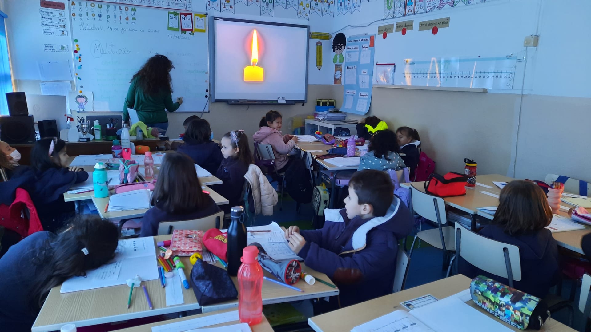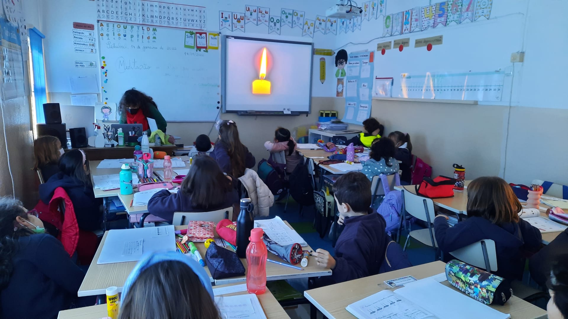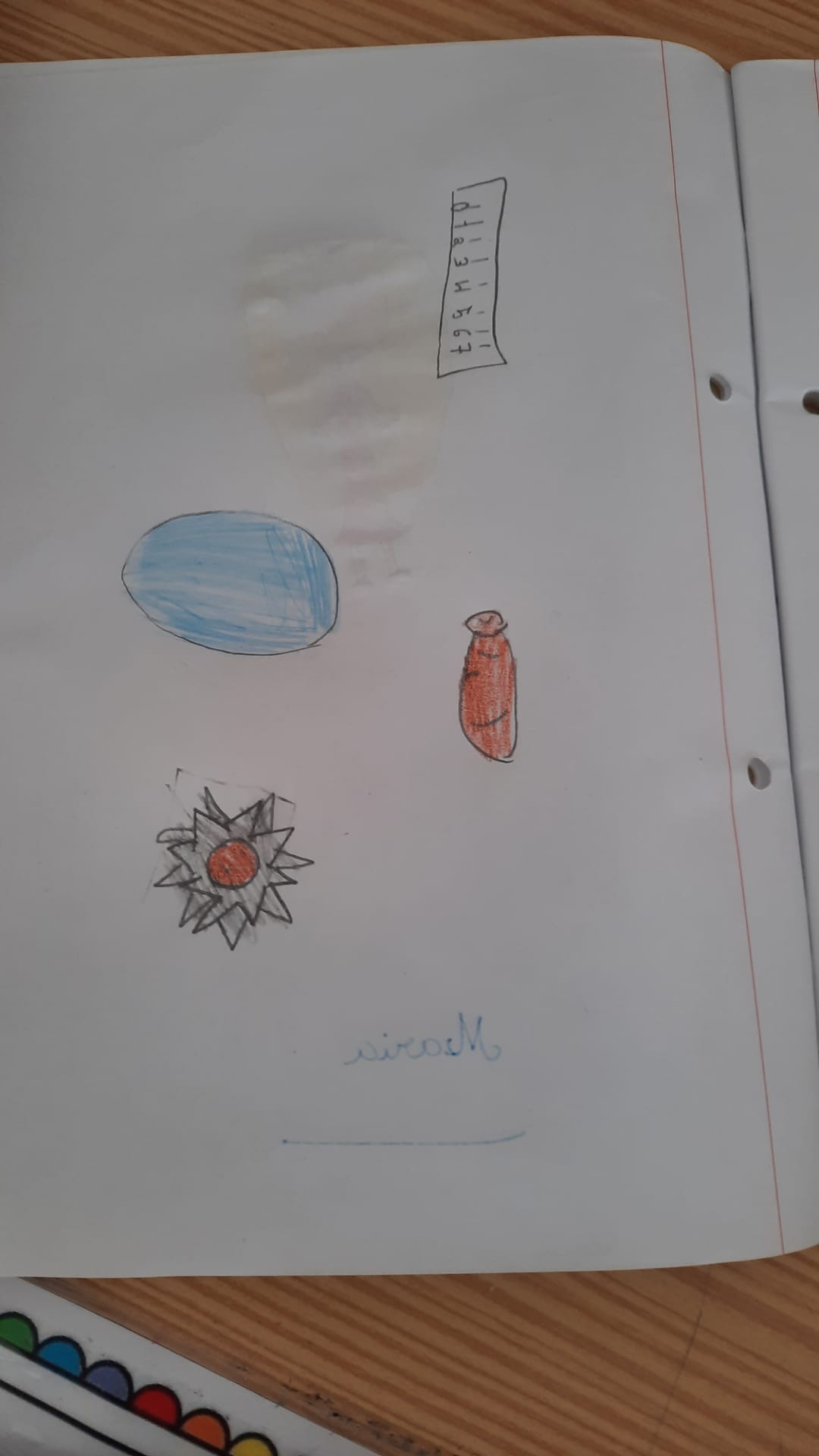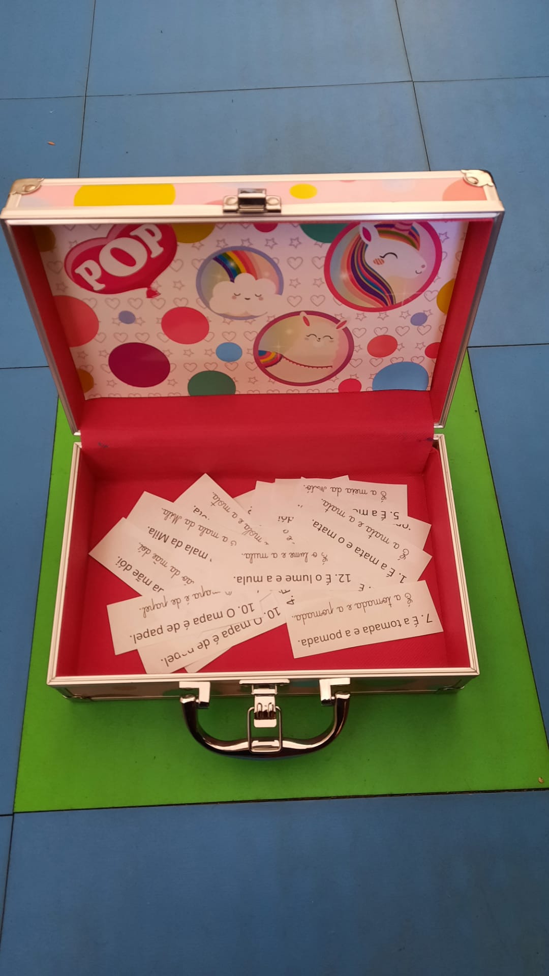 Em português foi apresentado o livro Mia e a montanha,  de onde surgiram várias palavras começadas com a letra m; ou palavras que a continham. Identificaram palavras em frases, dividiram palavras em sílabas e chegaram às sílabas. Exploraram a história e descobriram o grafema m, maiúsculo e minúsculo, utilizando diversos recursos. Por fim, a professora apresentou-nos a história da letra m, que não queria continuar só a ser ma, me, mi, mo e mu, mas queria passar a ser também am, em, im, om e um. A partir daí descobrimos um novo caso de leitura, lemos palavras e frases.