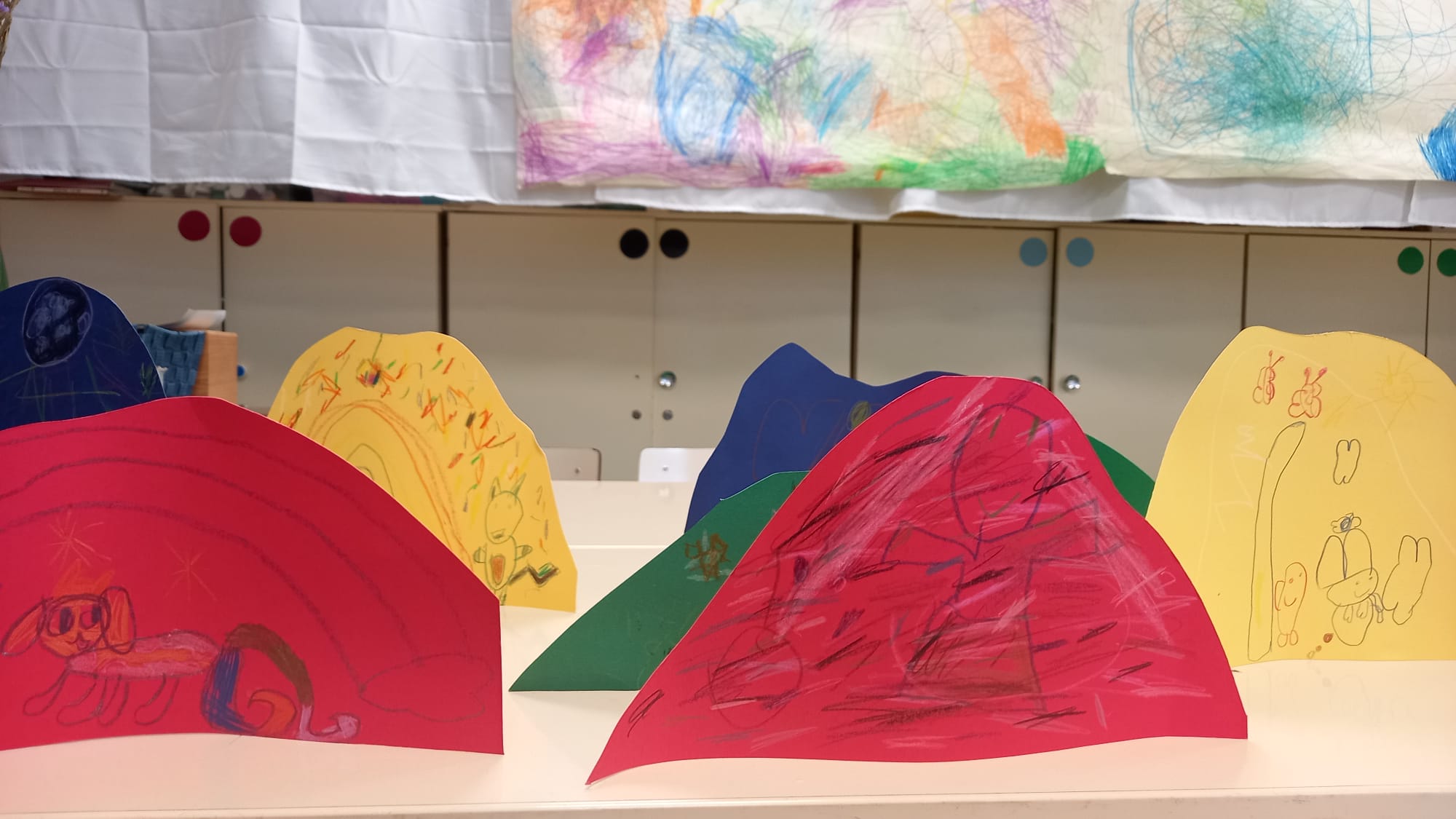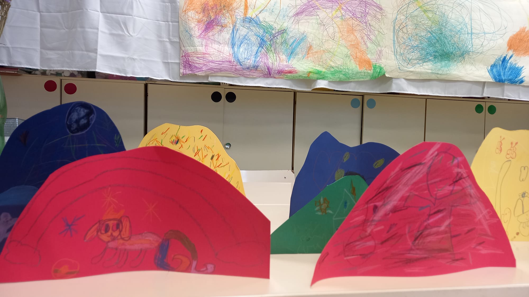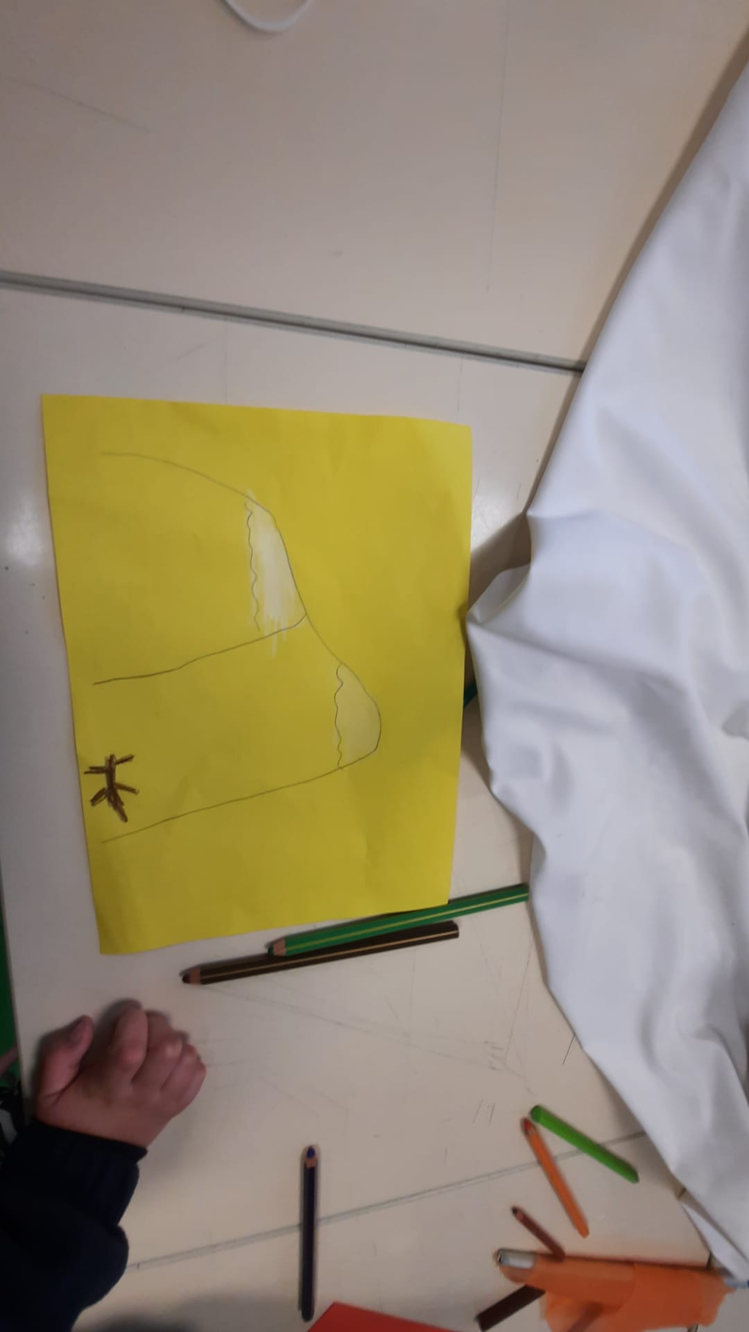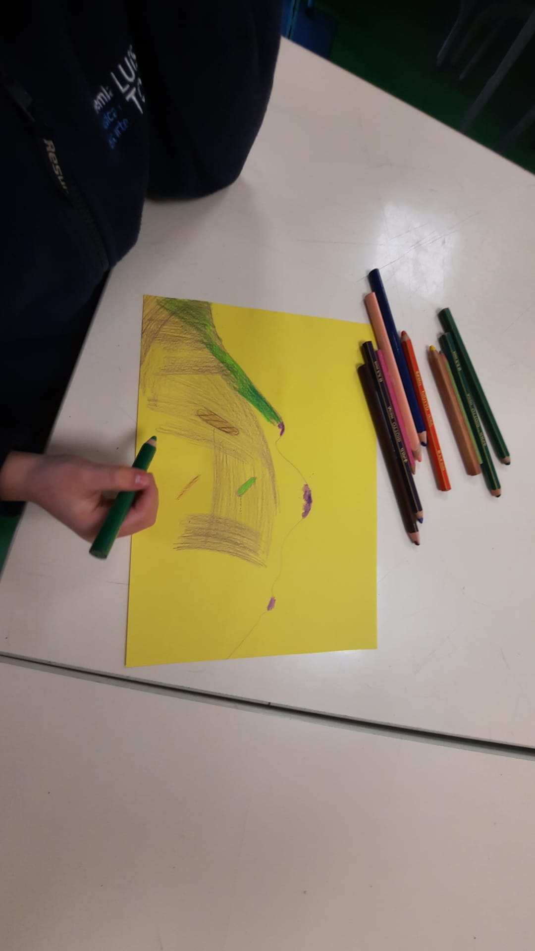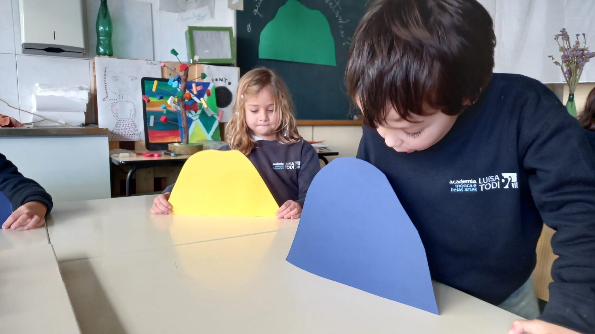 Nas artes visuais o mote: “O que guarda a montanha?” foi lançado. A partir daí realizámos um exercício de estimulação sensorial. E fizemos o desenho de silhueta de montanha.