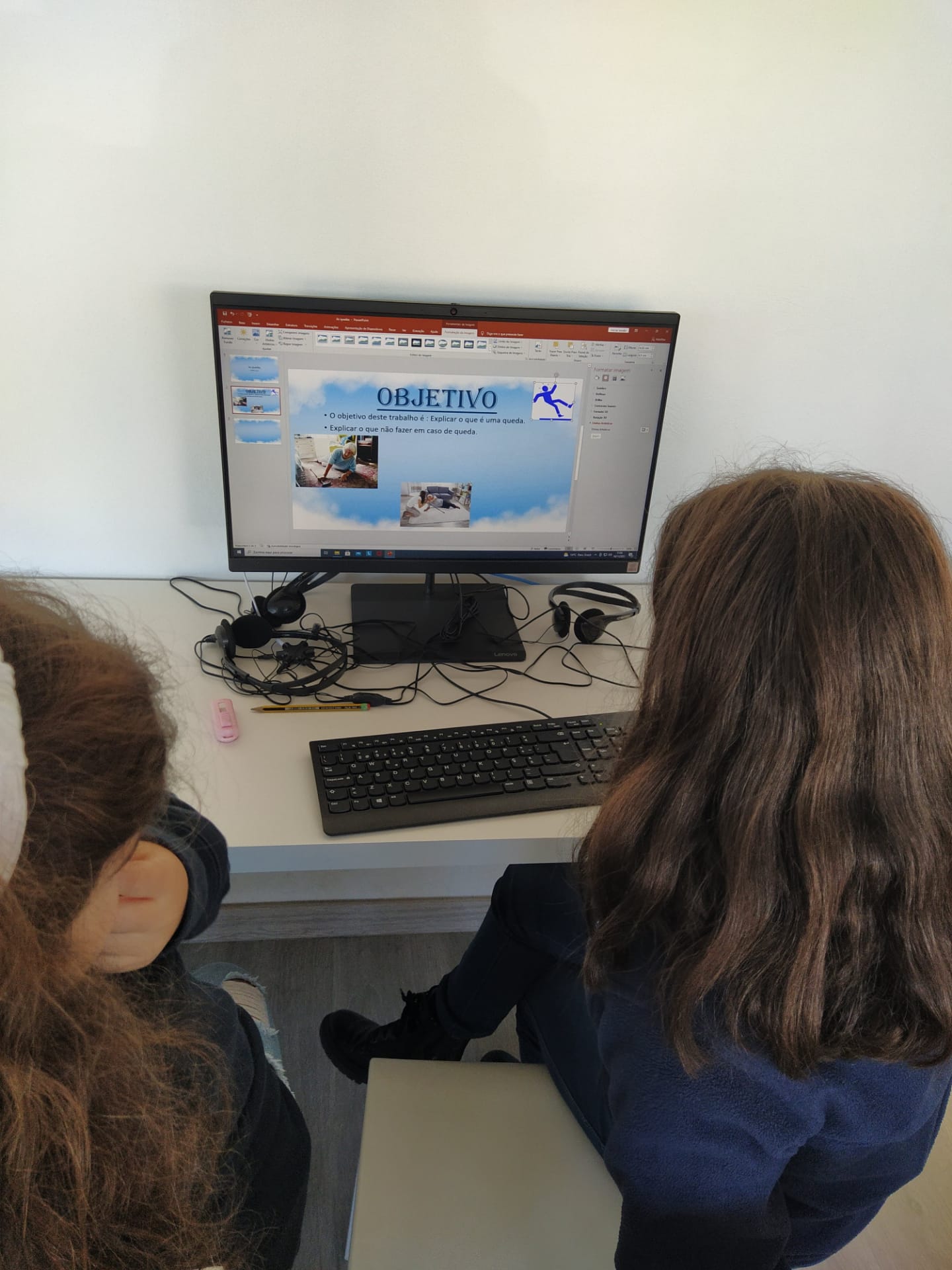 Na aula de informática aprenderam a criar apresentações no PowerPoint para a construção do trabalho de grupo.