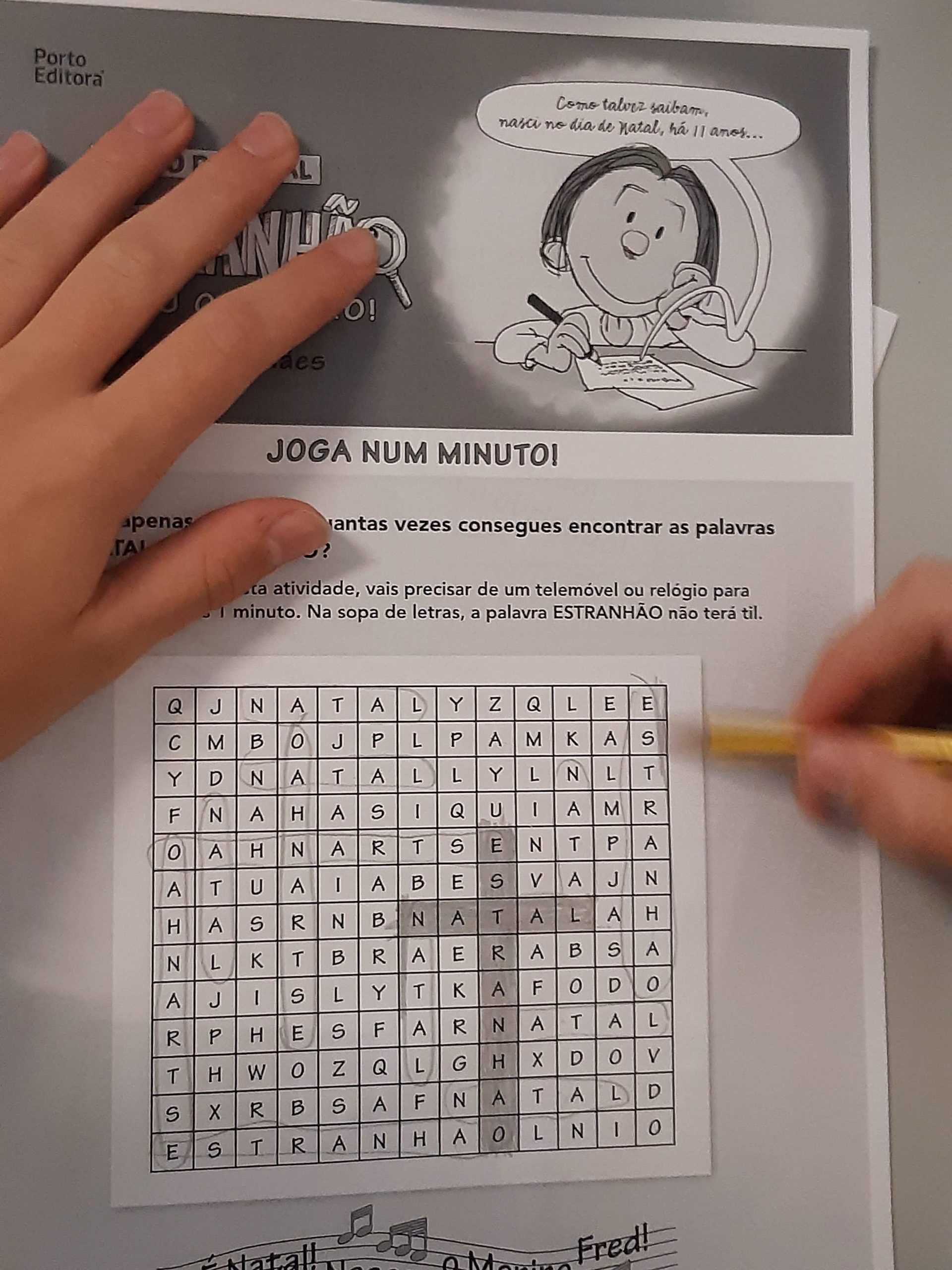 Leitura do conto de Natal “Nasceu um menino!”, de Álvaro Magalhães. Sobre o conto, foram realizados jogos didáticos: sopa de letras, crucigramas e um pequeno texto com três palavras e uma letra proibida.