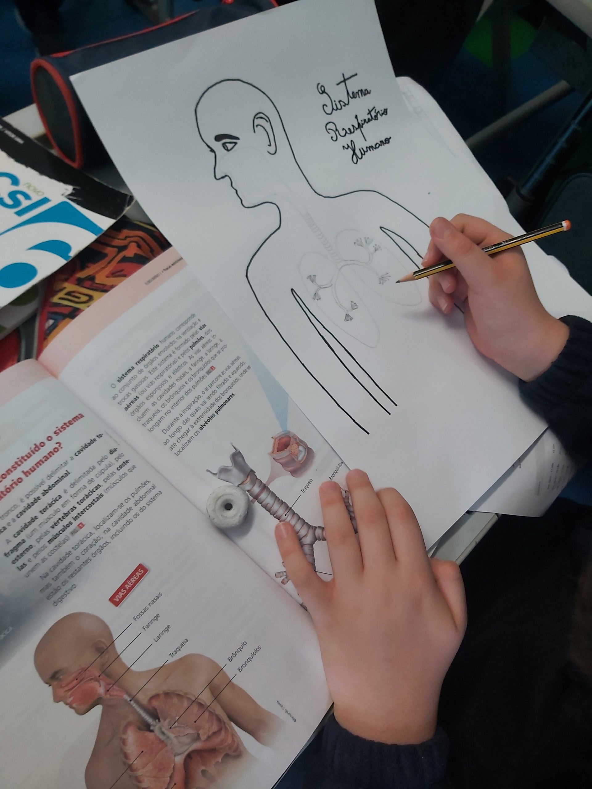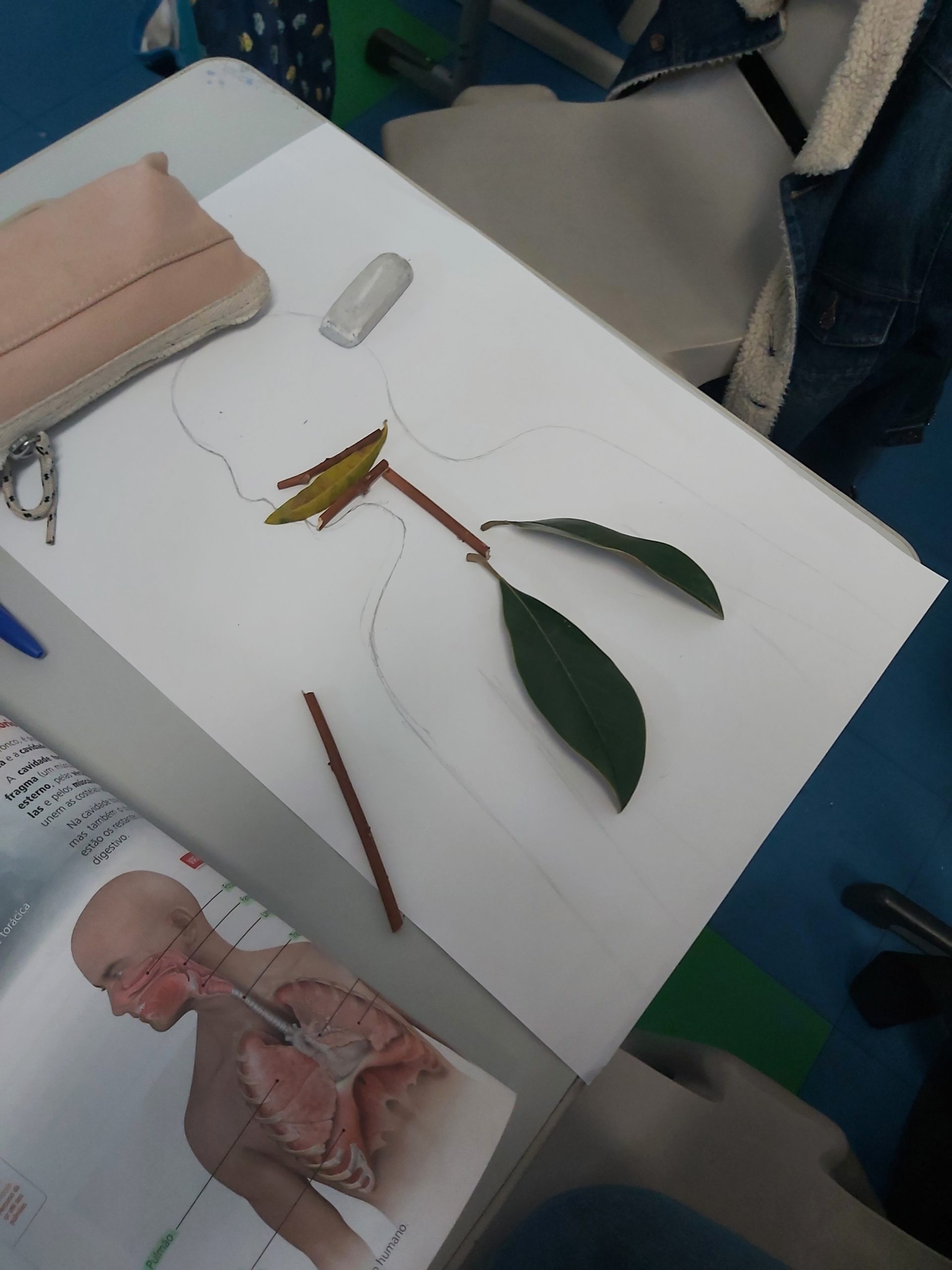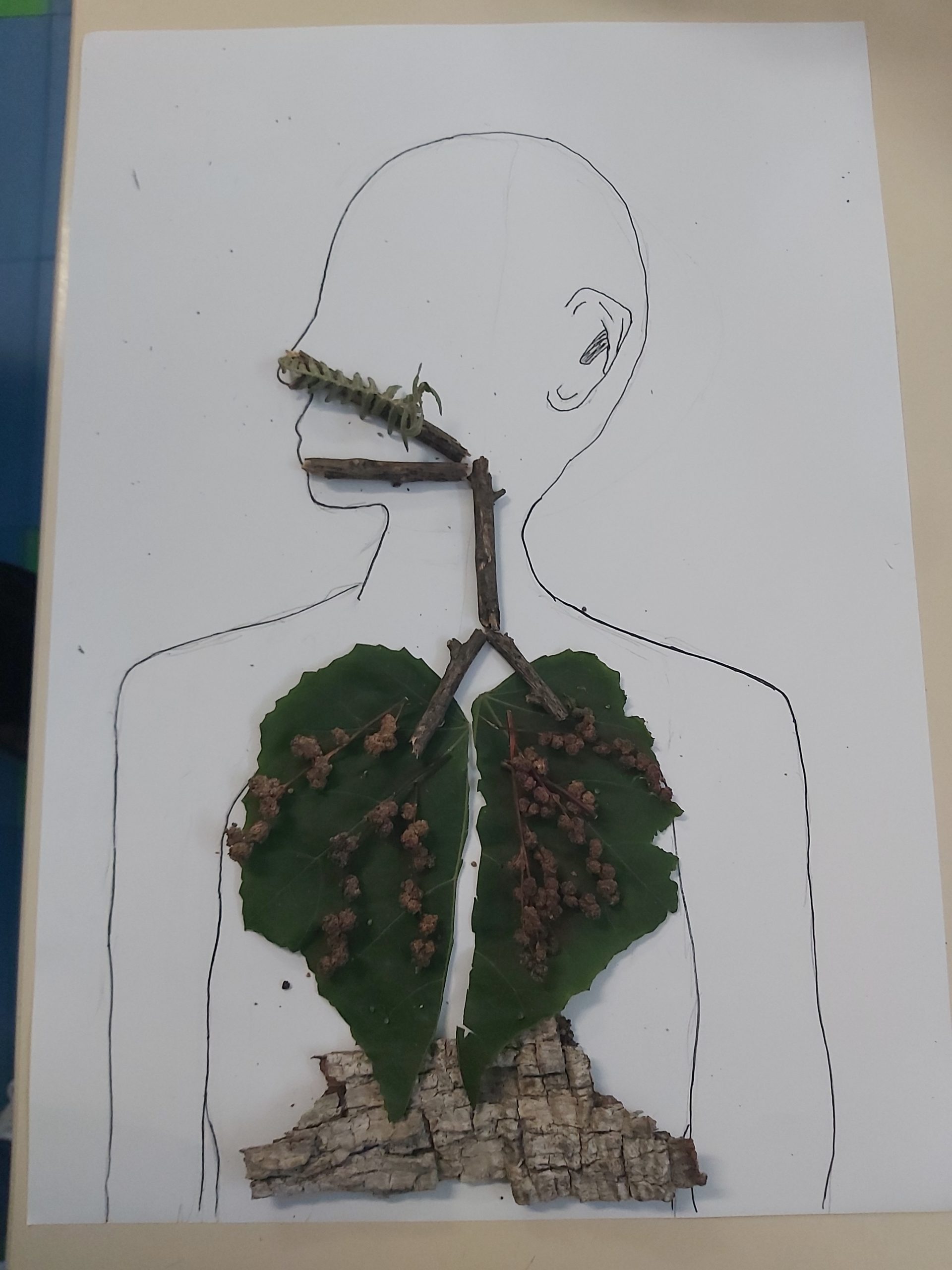 Ciências Naturais – Os alunos representaram o sistema respiratório humano e de alguns animais a partir da silhueta e representando os órgãos com elementos de plantas (pequenos ramos, sementes, folhas, etc.) Discutiu-se a importância das plantas na produção de oxigénio, gás essencial à sobrevivência dos restantes seres vivos.