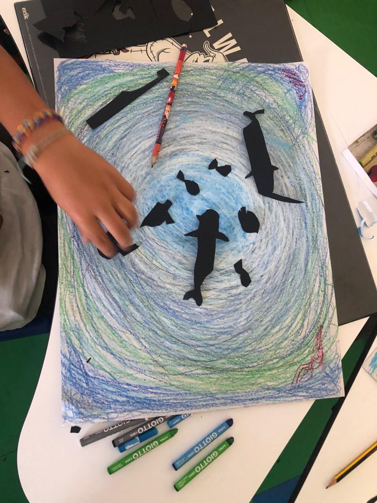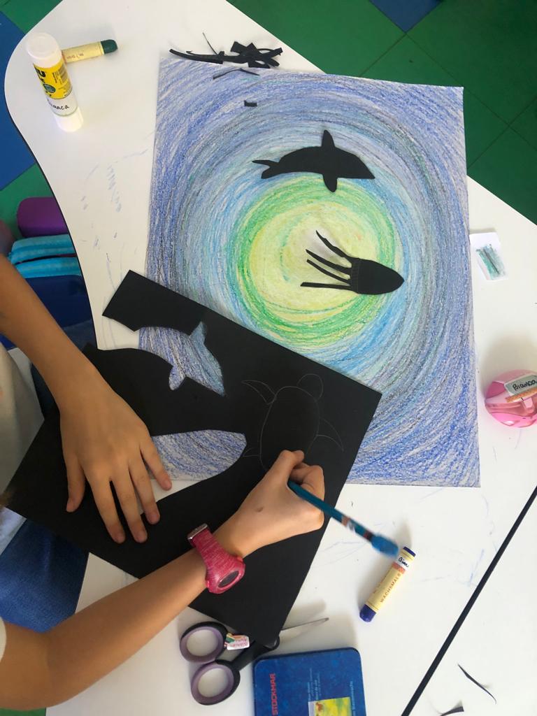 1. Os alunos fizeram uma experimentação e criação, onde utilizaram e exploraram cores que caracterizam o oceano. Depois adicionaram-lhe um pouco de vida animal, utilizando apenas cartolina preta.