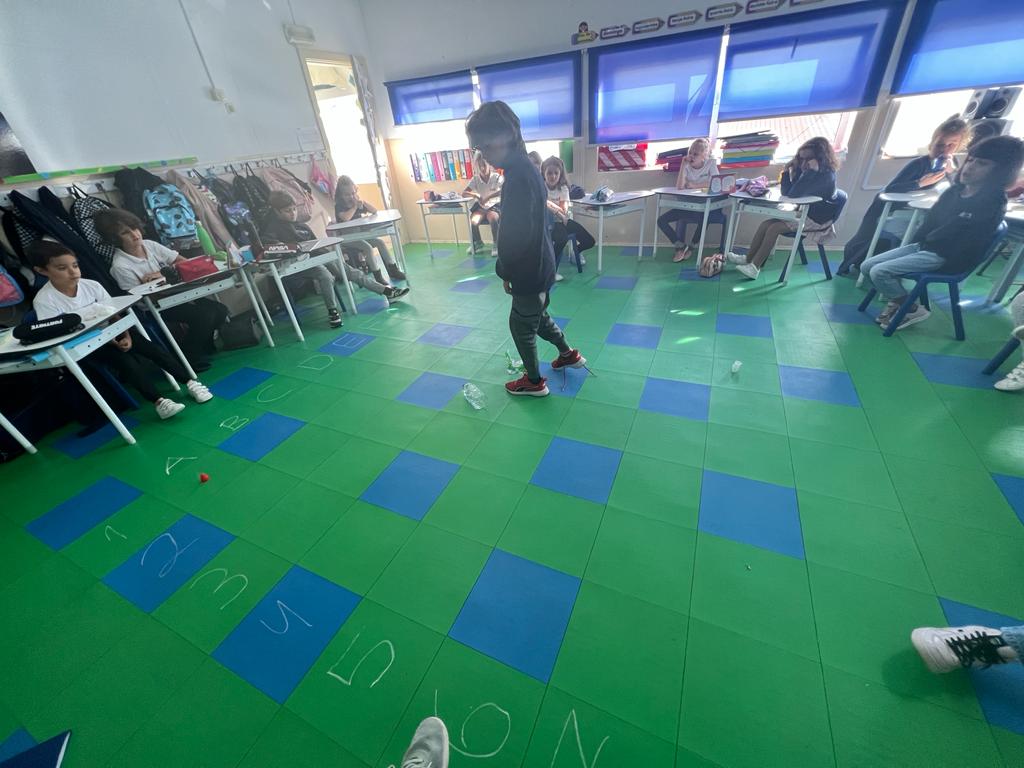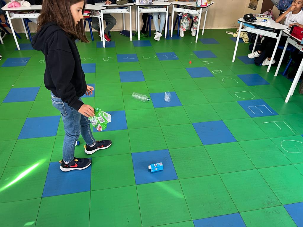 Aprendemos sobre representações gráficas e análise crítica de gráficos, analisámos representações gráficas e discutimos criticamente a sua adequabilidade, desenvolvendo a literacia estatística. Além disso, aprendemos sobre orientação espacial (coordenadas) e, para treinarmos, transformámos o chão da nossa sala numa “batalha naval”, onde reutilizámos alguns materiais da nossa sala, que mais tarde foram para a reciclagem, para os localizar no espaço através das coordenadas.
