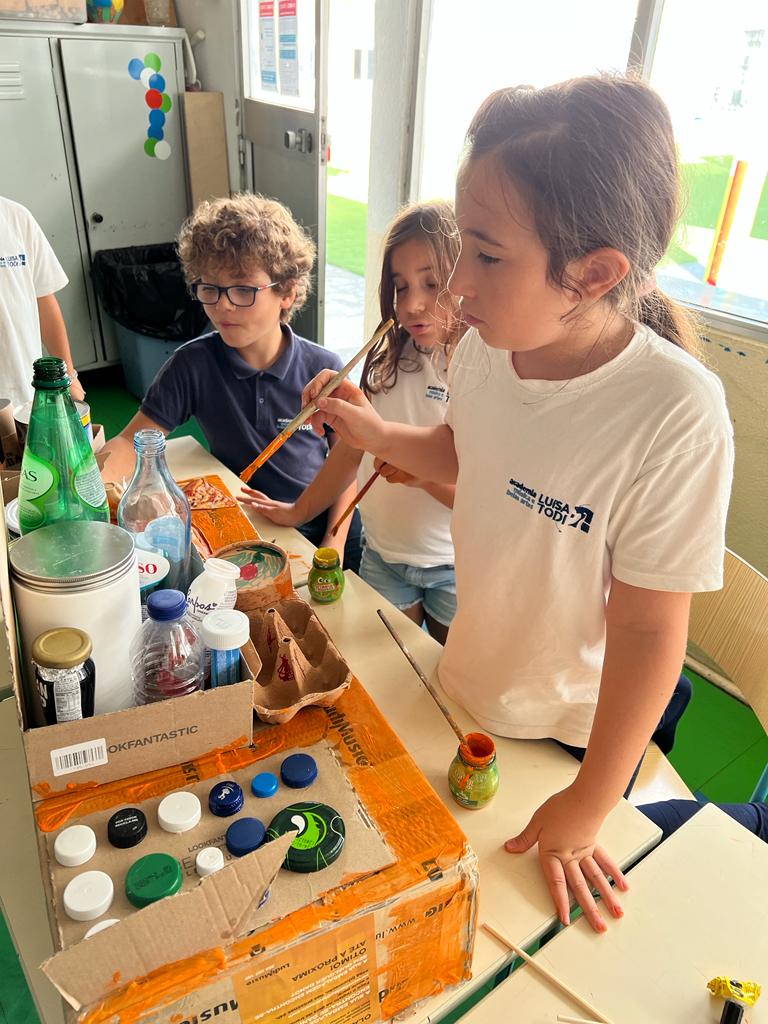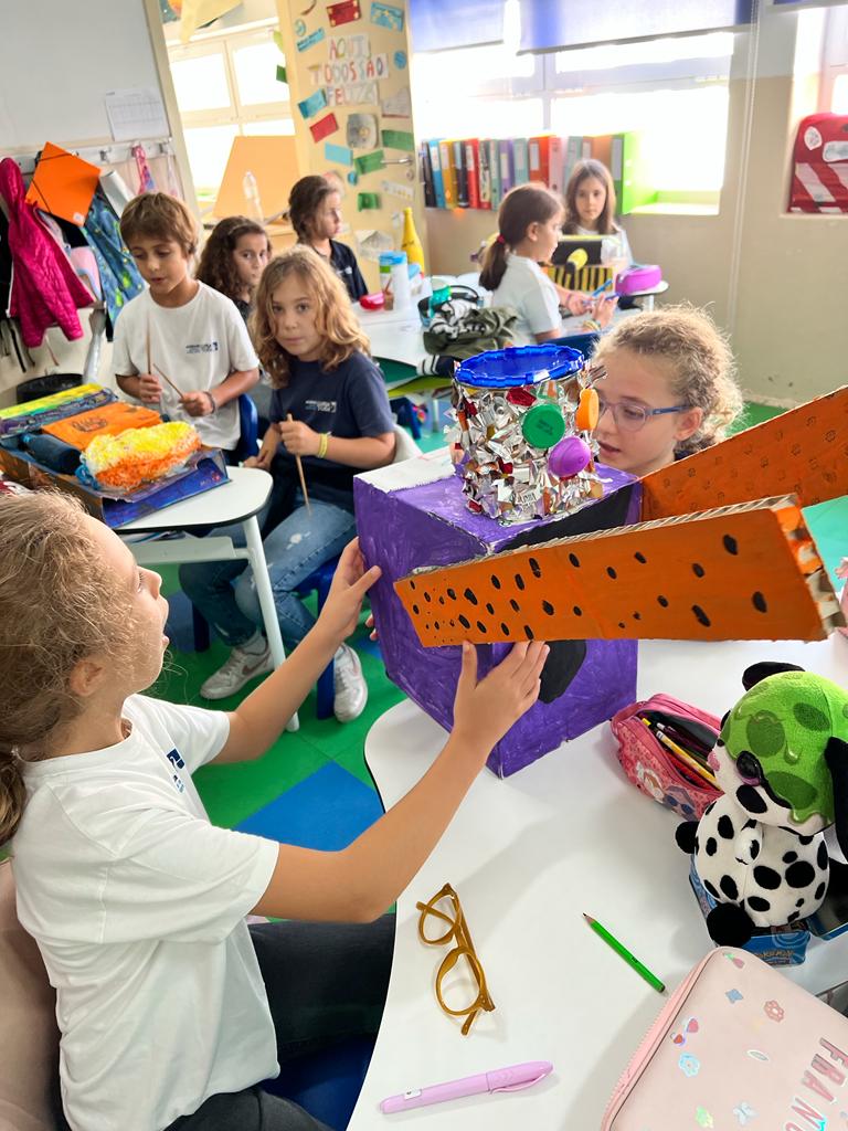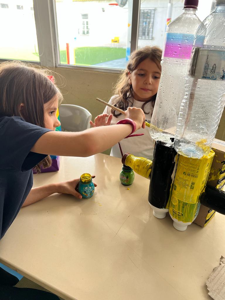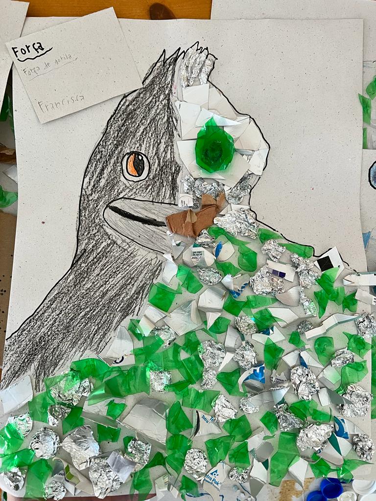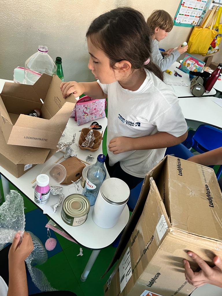 2. Descobrimos as obras do artista Bordallo II e fomos procurar mais sobre elas e o respetivo autor. Também quisemos construir as nossas obras, de acordo com as características utilizadas por Bordalo II, e com a ajuda das famílias e de alguns colegas de outras turmas, juntámos imensos materiais que iam para o lixo. Reutilizámos e construímos desenhos de animais, esculturas, instrumentos musicais…
