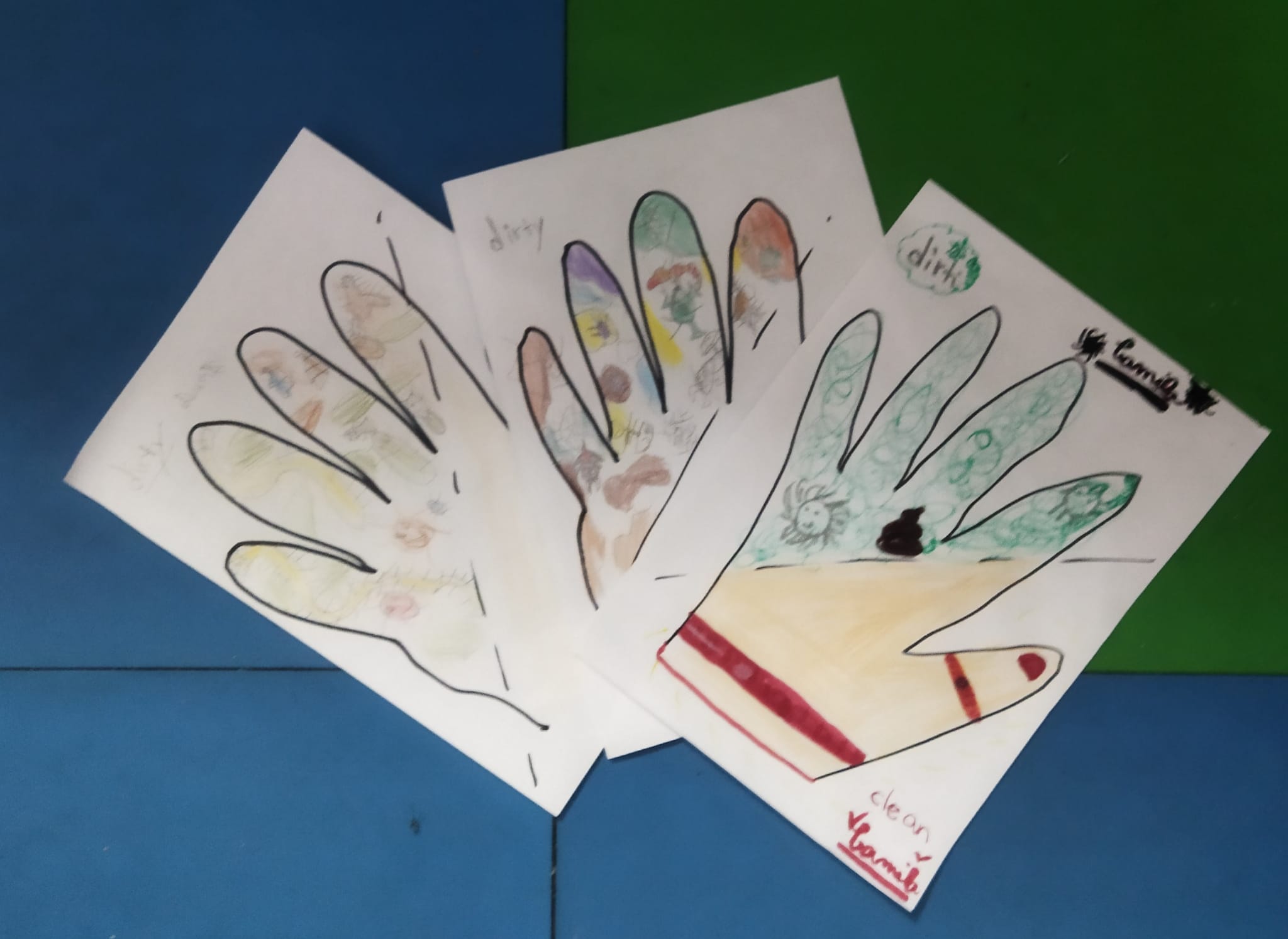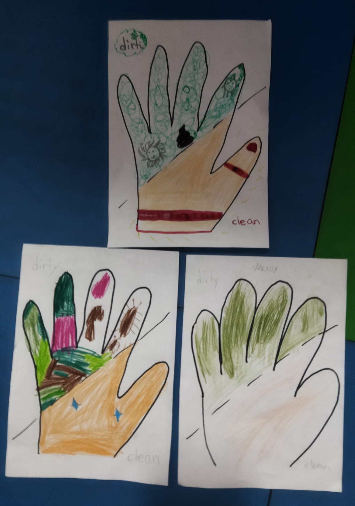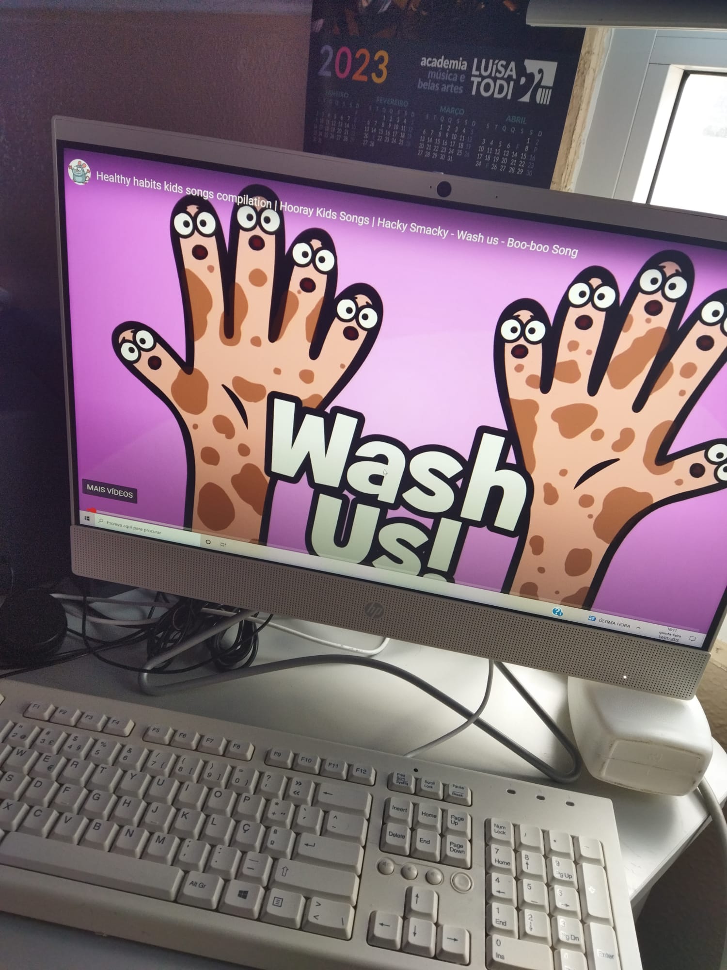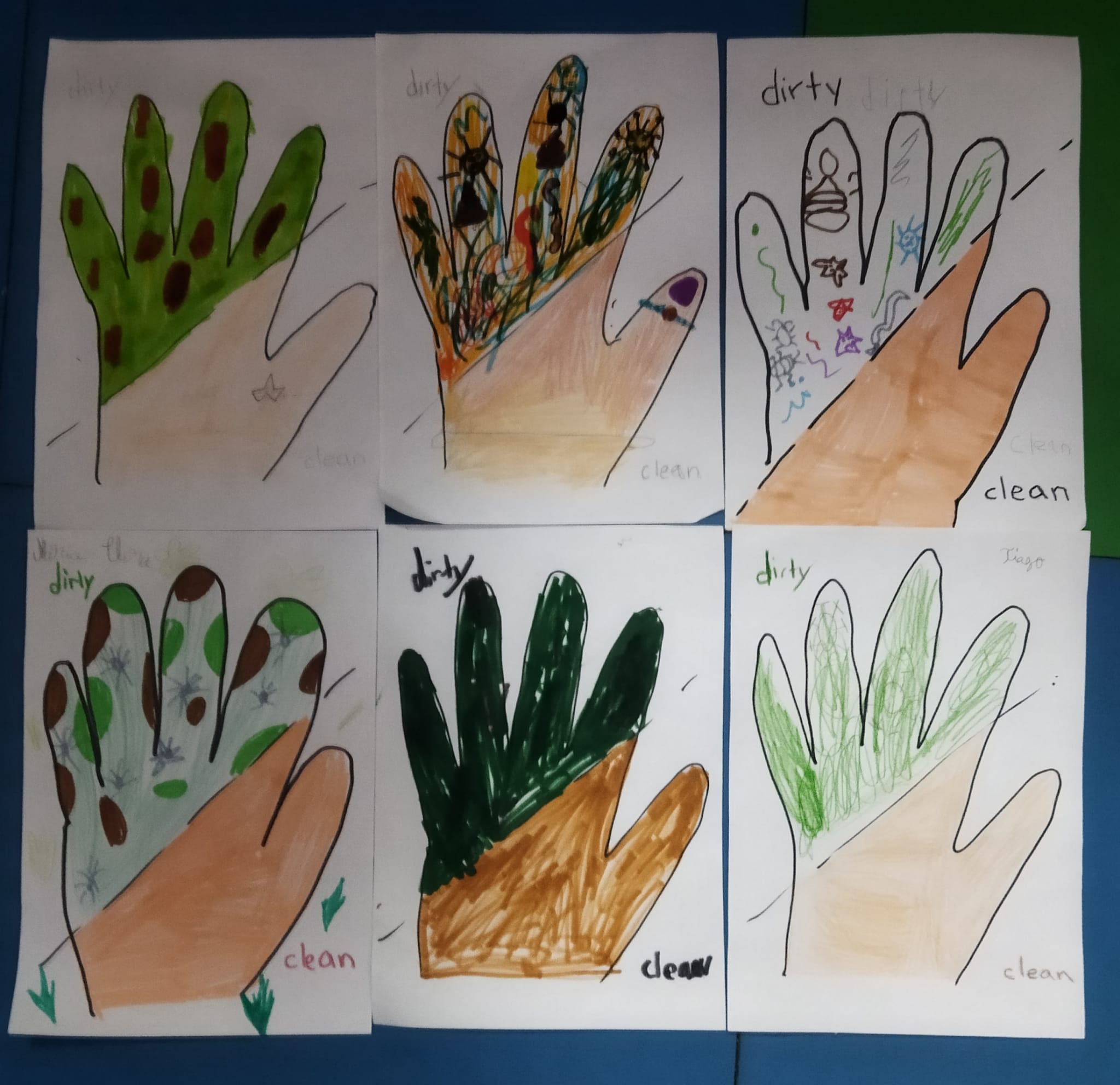 Em inglês os alunos aprenderam uma canção sobre a higiene diária: mãos limpas e sujas.