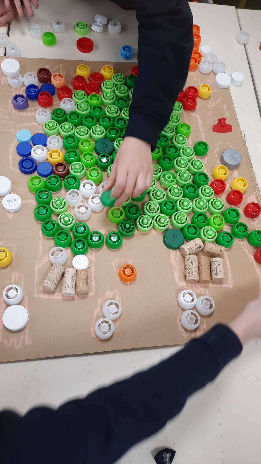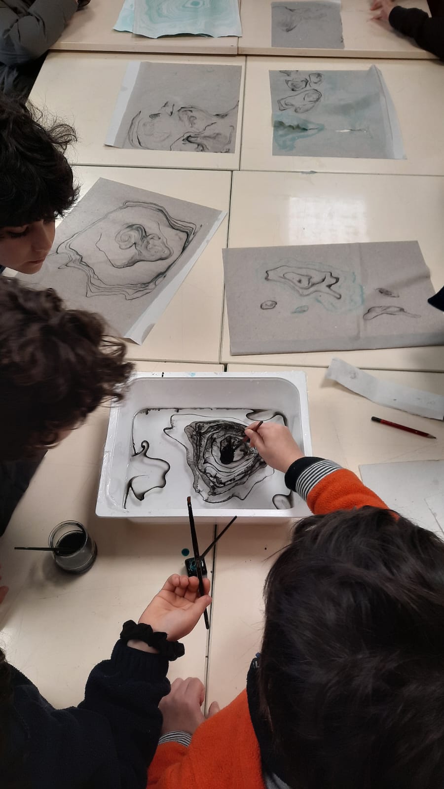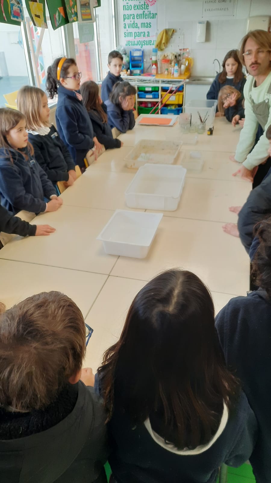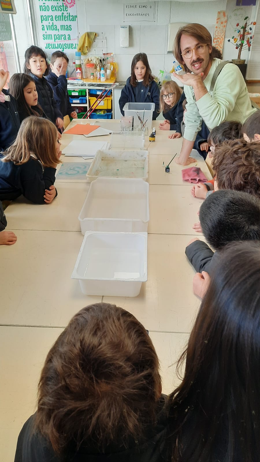 Em artes visuais visualizámos o documentário: Lixo Extraordinário, de Vik Muniz – retratos com Lixo e fizemos a composição visual com tampas (material reciclado). Aprendemos a técnica suminagashi: água e tinta, desenhámos a partir de manchas de tinta e a partir das formas das nuvens.
