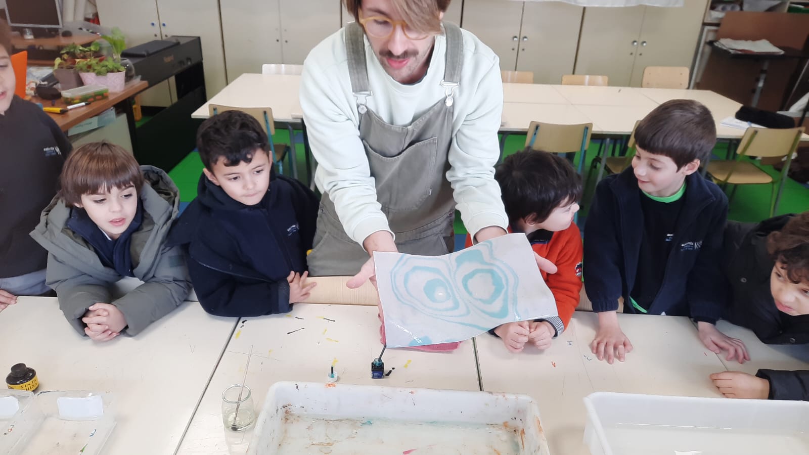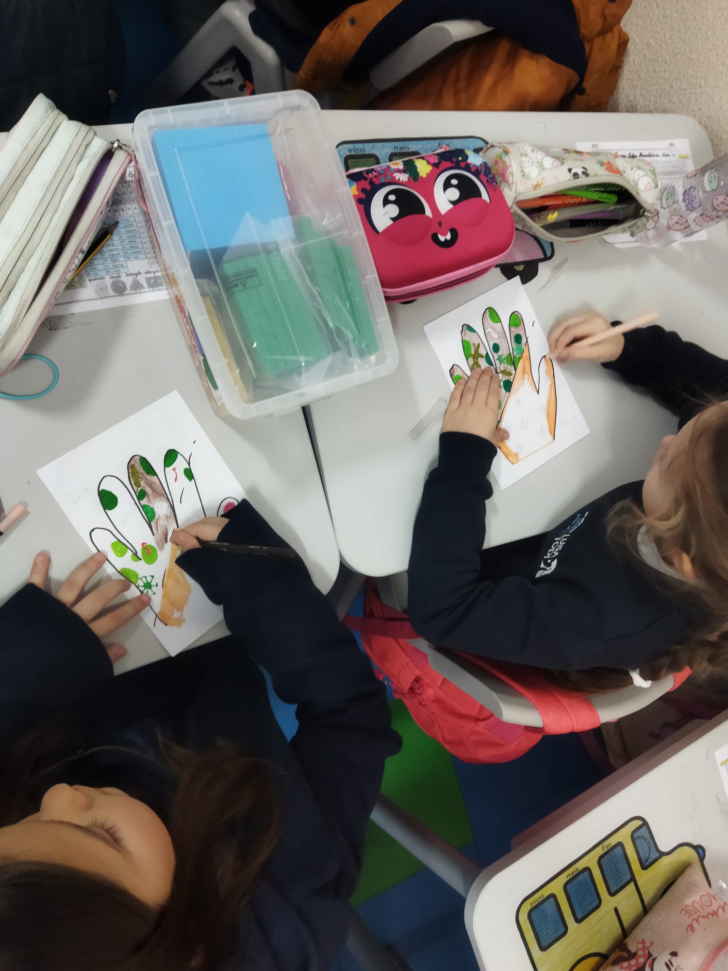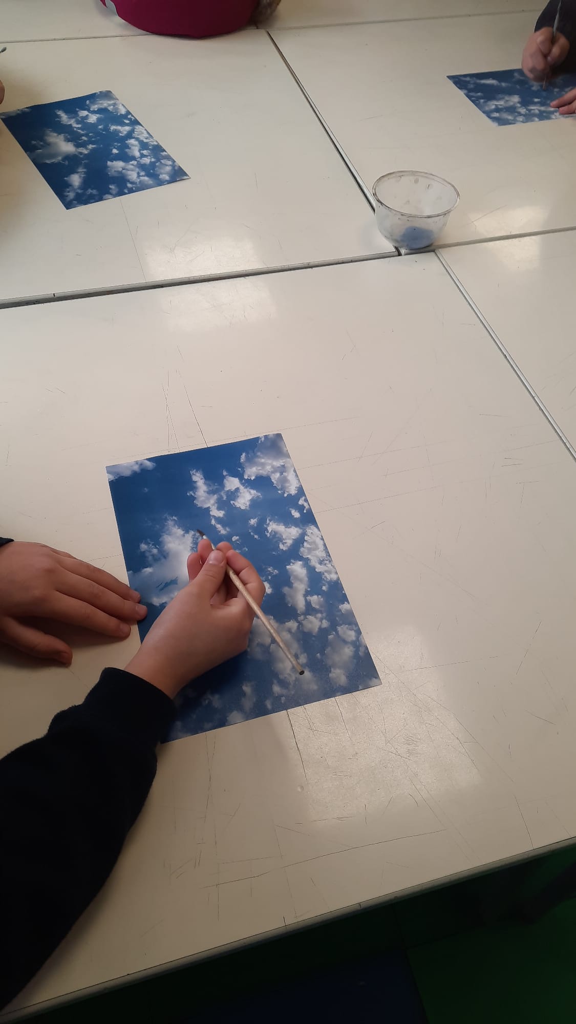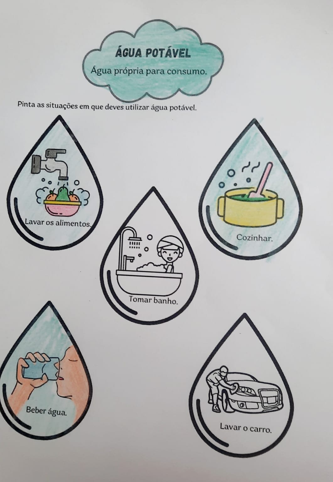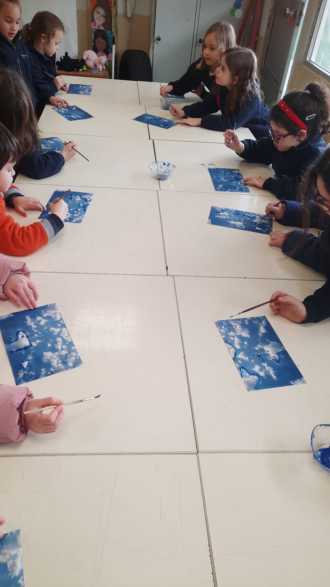 Em artes visuais visualizámos o documentário: Lixo Extraordinário, de Vik Muniz – retratos com Lixo e fizemos a composição visual com tampas (material reciclado). Aprendemos a técnica suminagashi: água e tinta, desenhámos a partir de manchas de tinta e a partir das formas das nuvens.