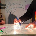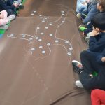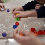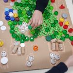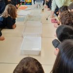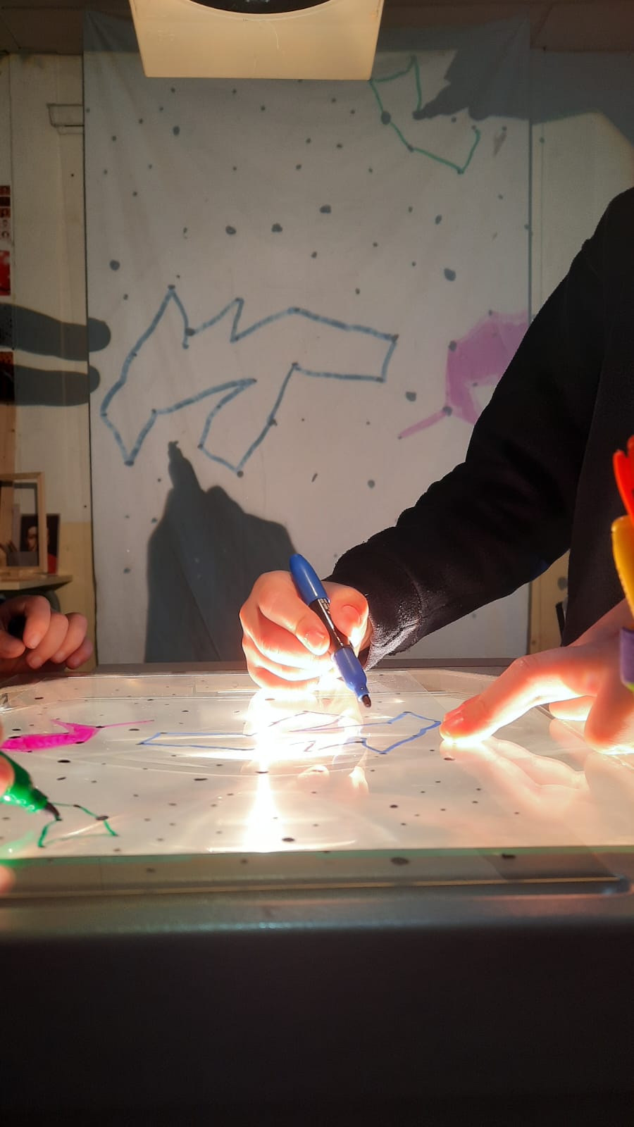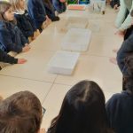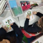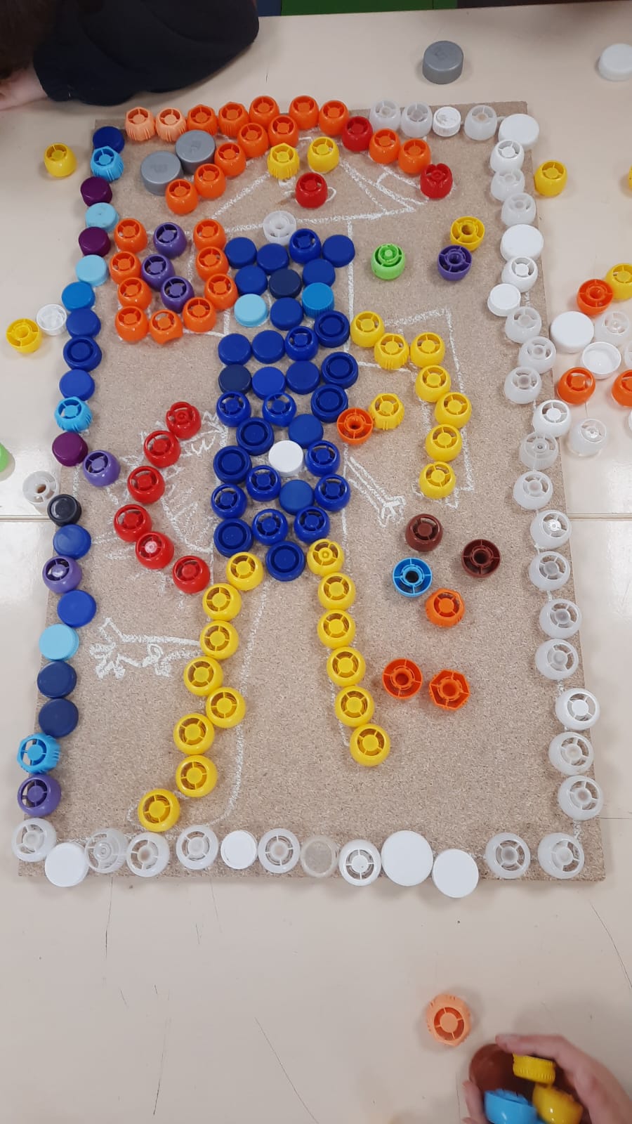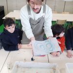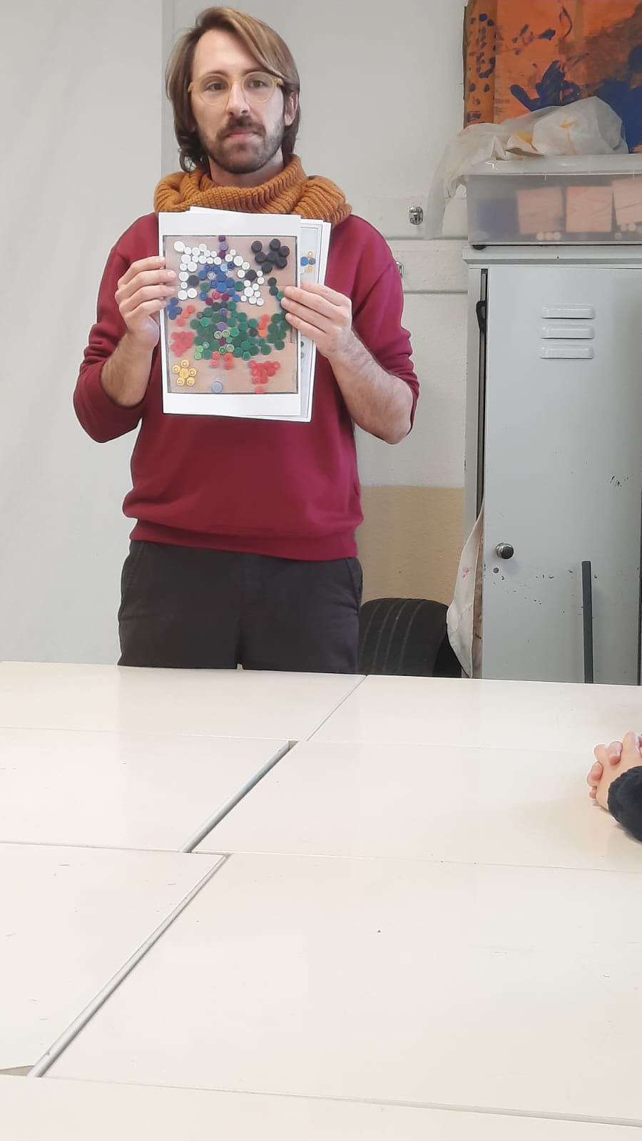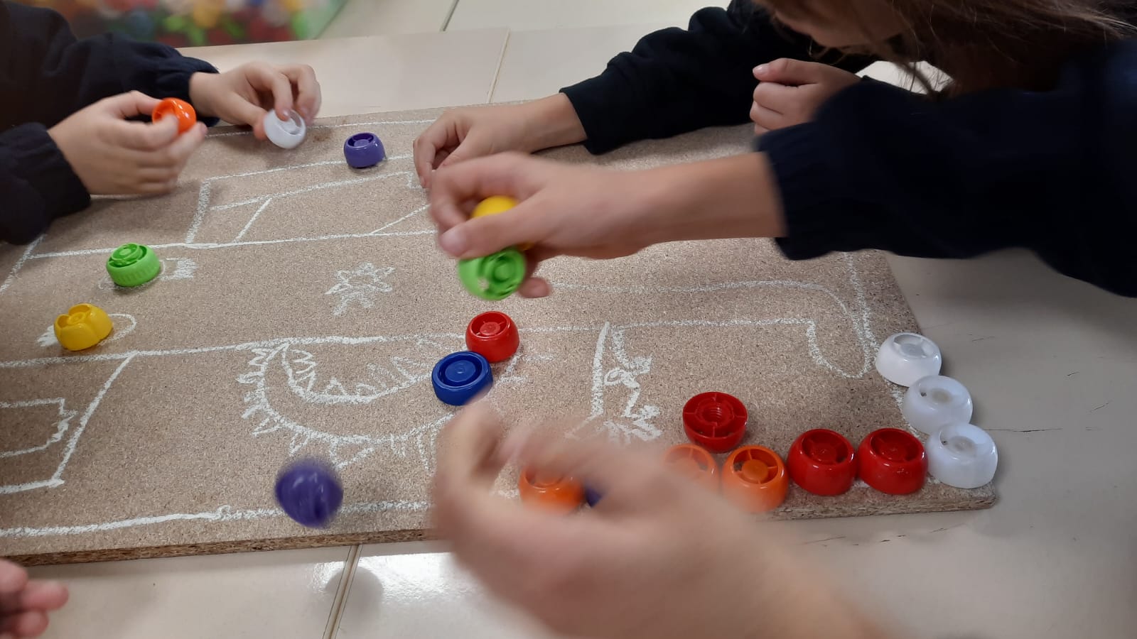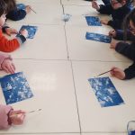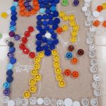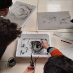 Em artes visuais visualizámos o documentário: Lixo Extraordinário, de Vik Muniz – retratos com Lixo e fizemos a composição visual com tampas (material reciclado). Aprendemos a técnica suminagashi: água e tinta, desenhámos a partir de manchas de tinta e a partir das formas das nuvens.